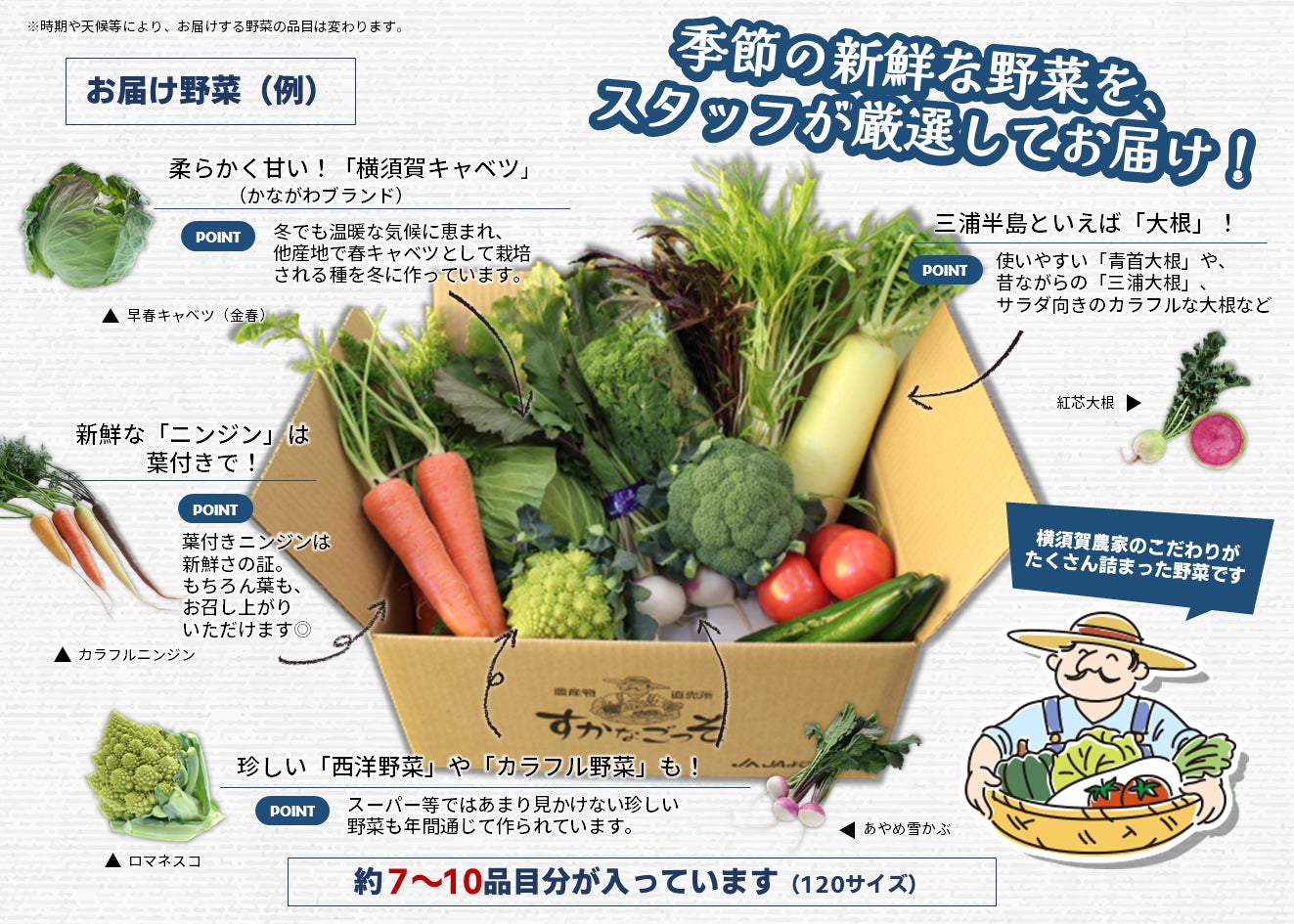 【内容例】キャベツ、なばな、サラダ大根、ラディッシュ、ブロッコリー、カリフラワー、温州みかん、レモン、サトイモ(八つ頭)、三浦大根、白菜など