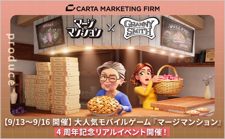 株式会社CARTA HOLDINGSのグループ会社で、マーケティング特化の事業を展開する株式会社CARTA MARKETING FIRM(東京都港区虎ノ門、代表取締役:西園 正志、以下CARTA MARKETING FIRM)がプロデュースする、Metacore Games Ltd(本社:フィンランド、CEO:Mika Tammenkoski、以下Metacore)のモバイル向けマージパズルゲーム『マージマンション』のリアルイベント「マージマンションカフェ in グラニースミス青山」が、2024年9月13日(金)から2024年9月16日(月・祝)まで開催されます。