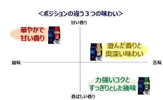 は、香り澄みわたるスペシャル・ブレンド、香り華やぐモカ・ブレンド、薫る深煎りキリマンジャ