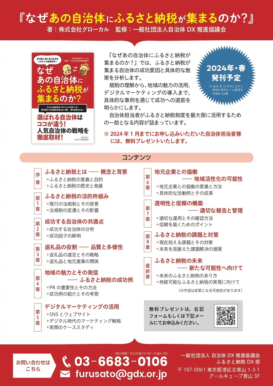 一般社団法人自治体DX推進協議会(以下、GDX)は、2024年春に、ふるさと納税の成功要因を徹底分析した書籍『なぜあの自治体にふるさと納税が集まるのか?』を発刊します。このガイドブックは、ふるさと納税制度を活用して地域の魅力を最大限に引き出す方法を紹介し、自治体担当者や地方創生に興味を持つ方々にとっての貴重な情報源となることを目指しています。