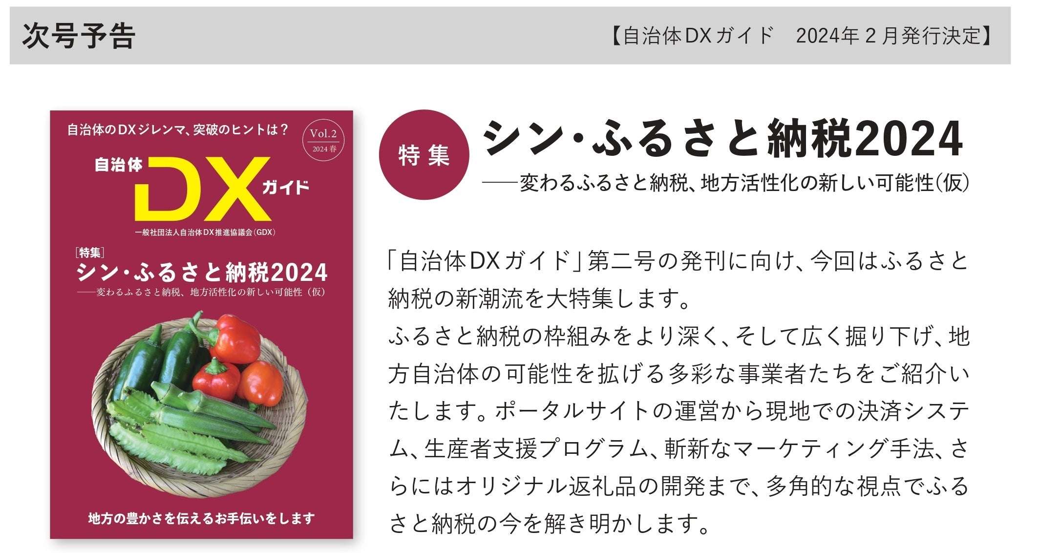 一般社団法人自治体DX推進協議会(GDX)『自治体DXガイド』第二号は2024年2月発行予定 / 特集「シン・ふるさと納税2024」 ~変わるふるさと納税、地方活性化の新しい可能性(仮)