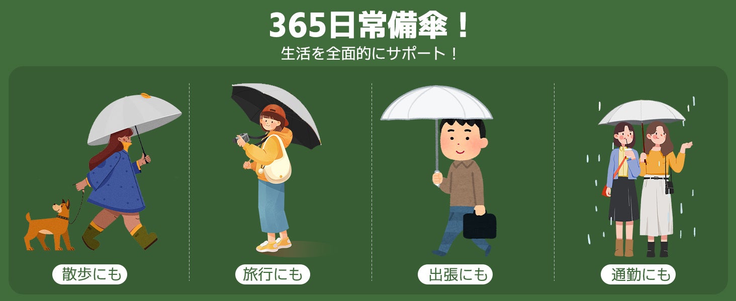小さくて超軽量なこの傘は、365日一年中使える常緑傘として、様々な生活シーンに適しています。