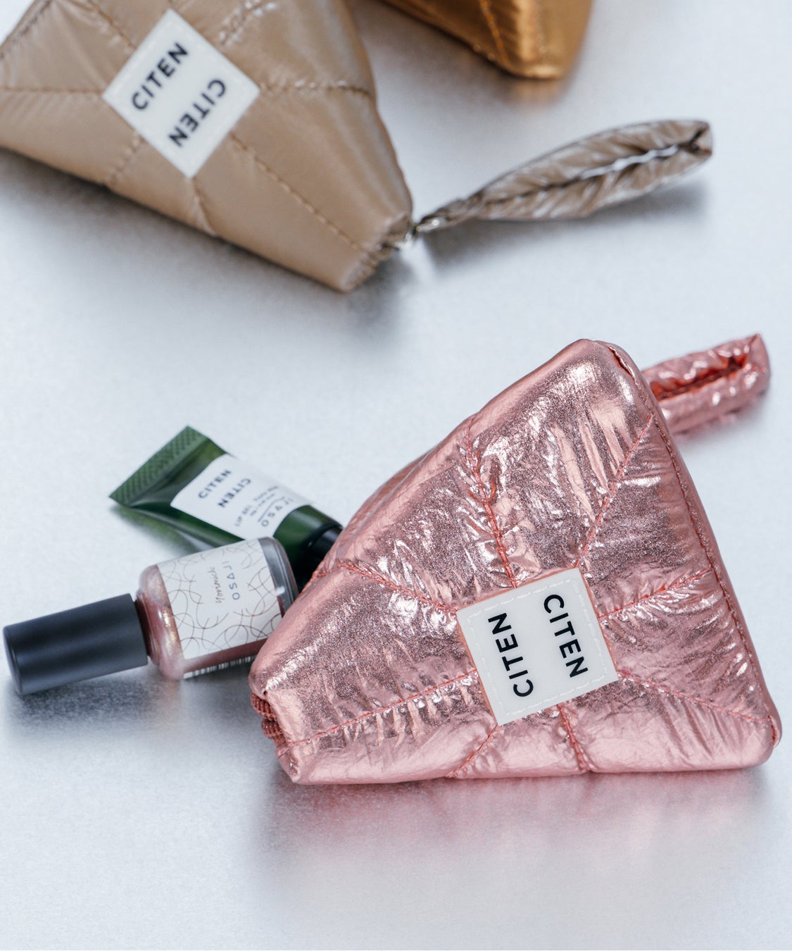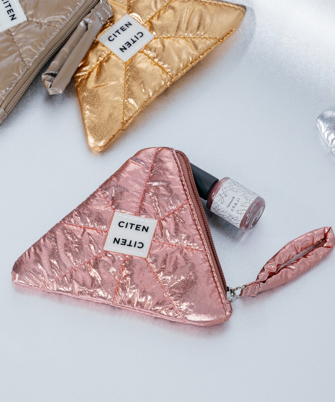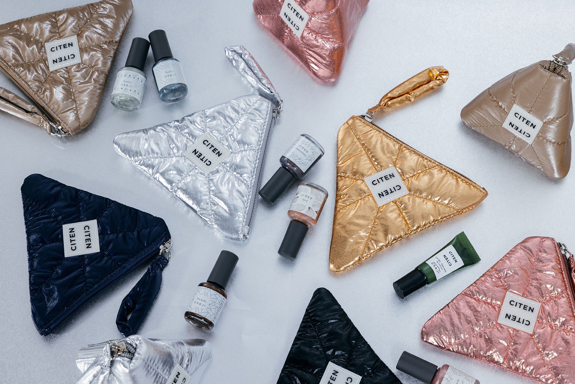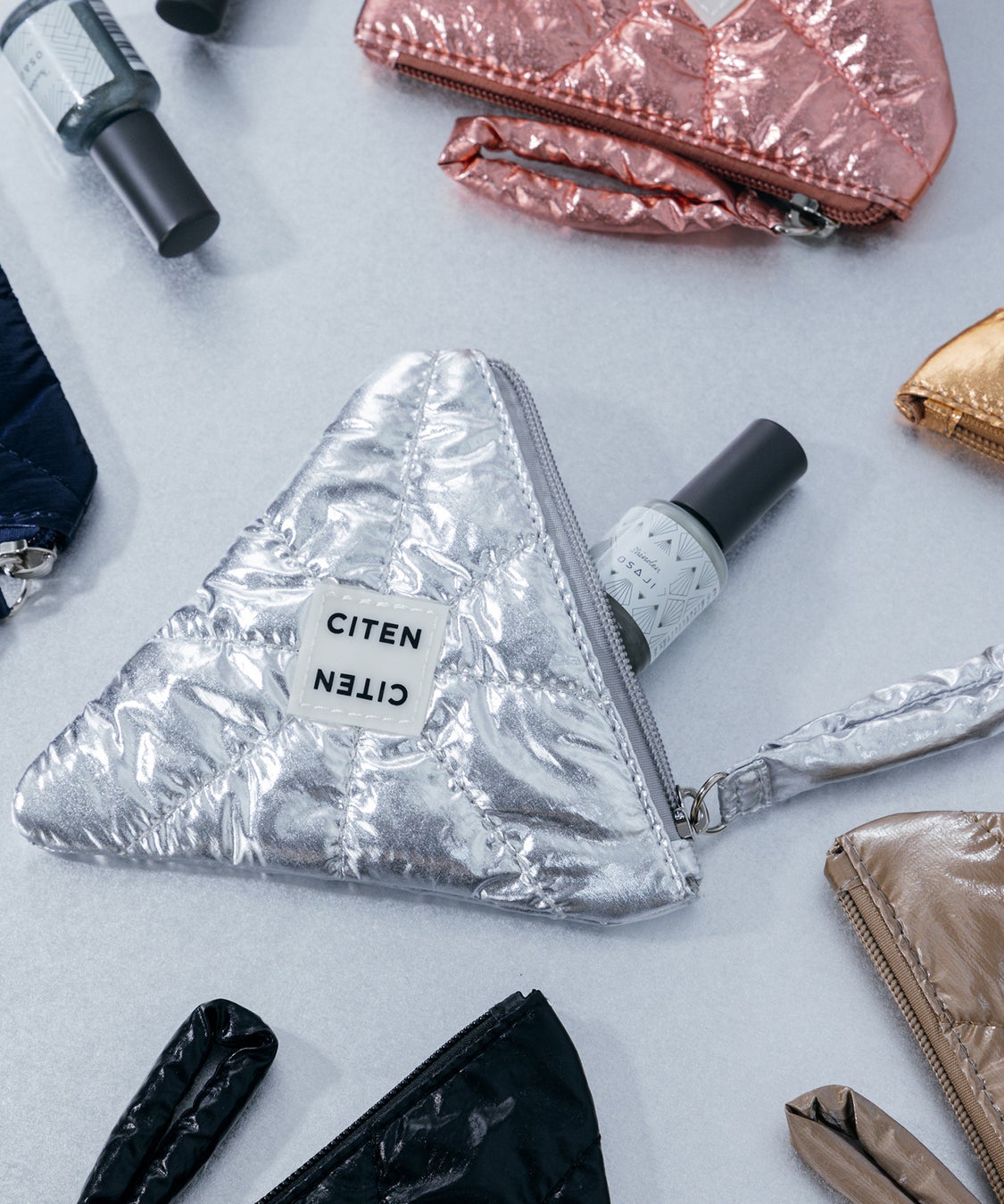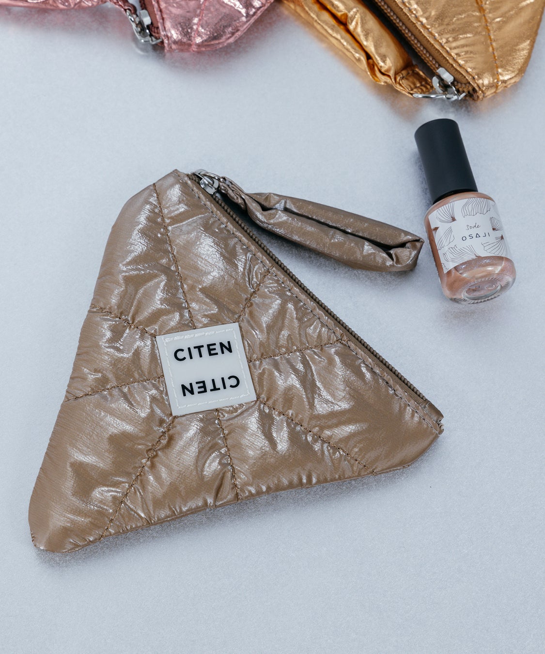 「CITEN」人気のパテッドキルティング素材をネイルの美しい光沢感にあわせたメタリックカラーに仕上げ、「OSAJI」のブランドロゴの“A”から着想を得た立体ポーチ。