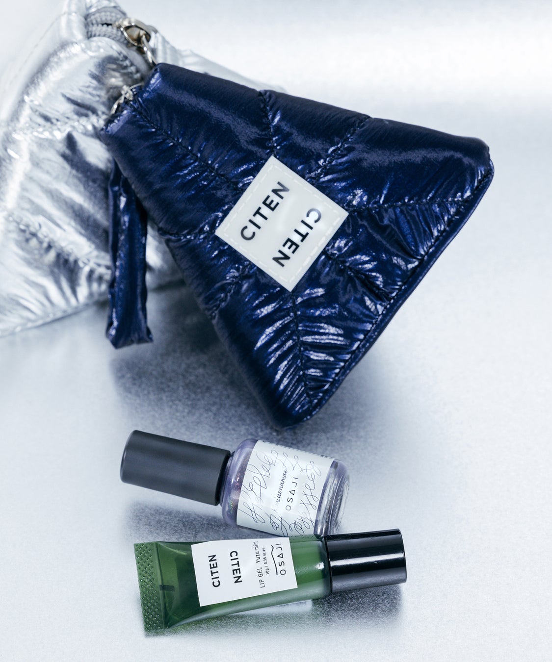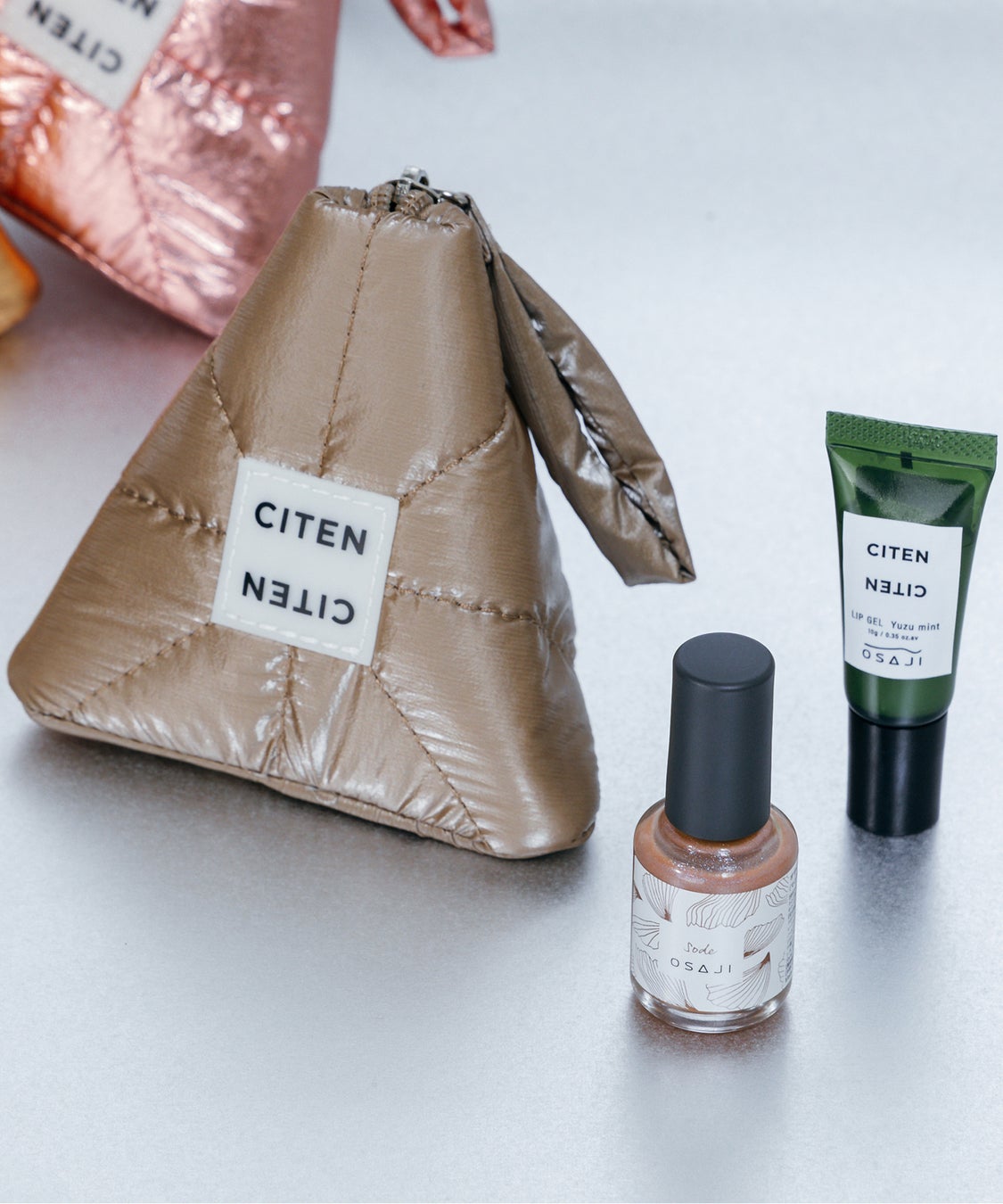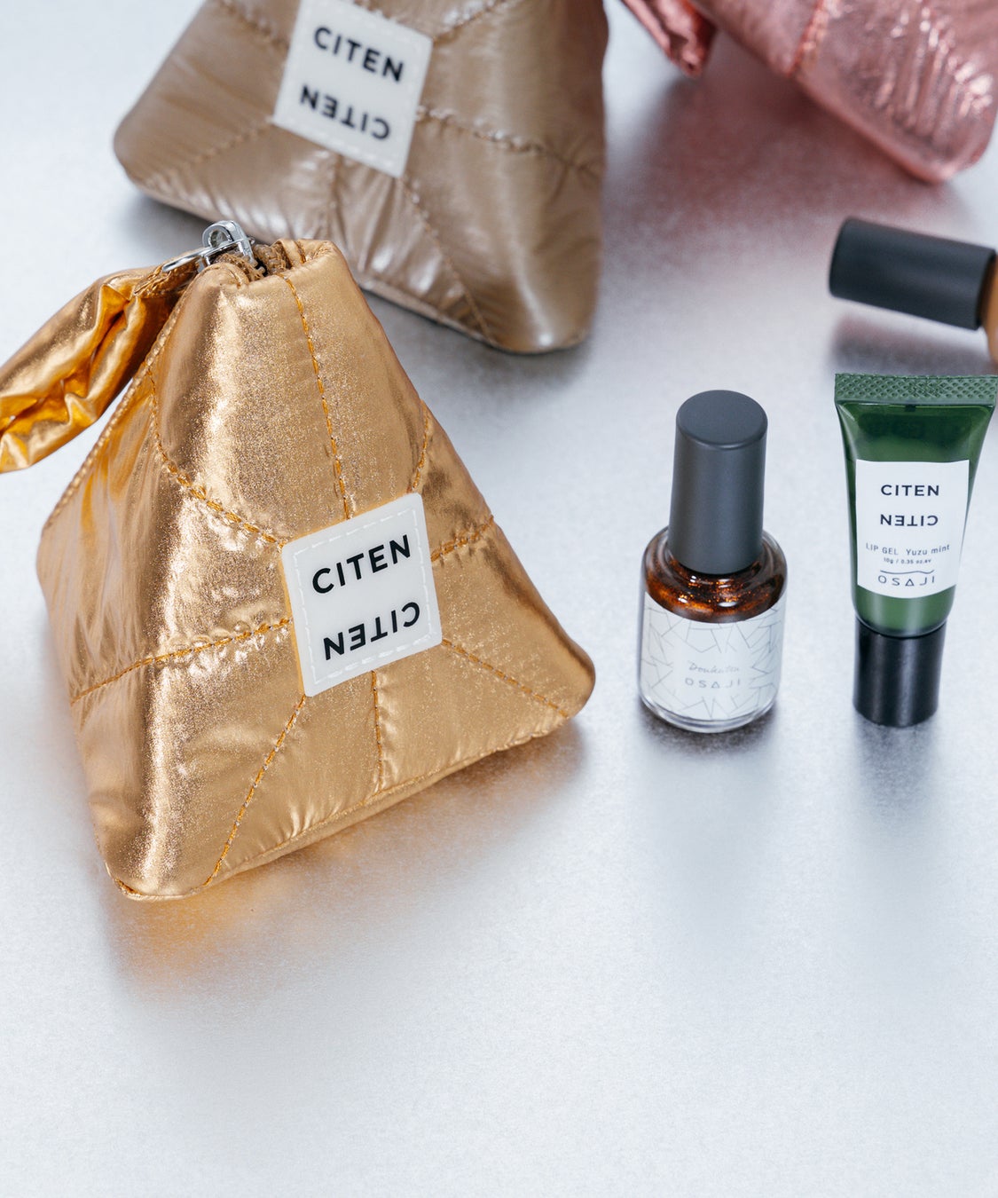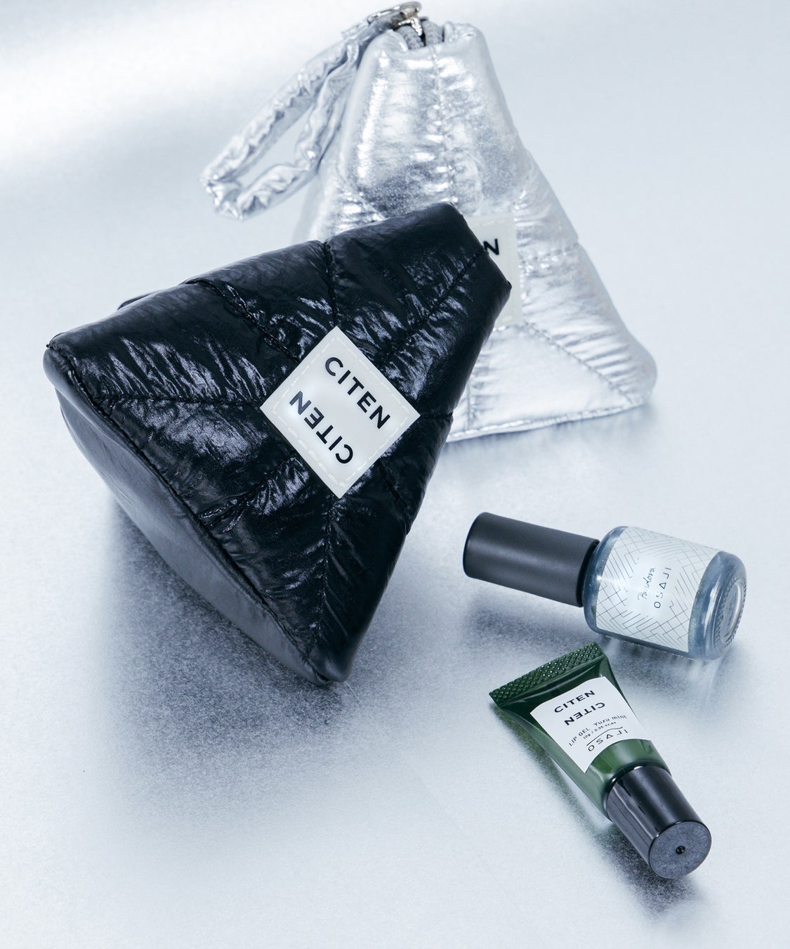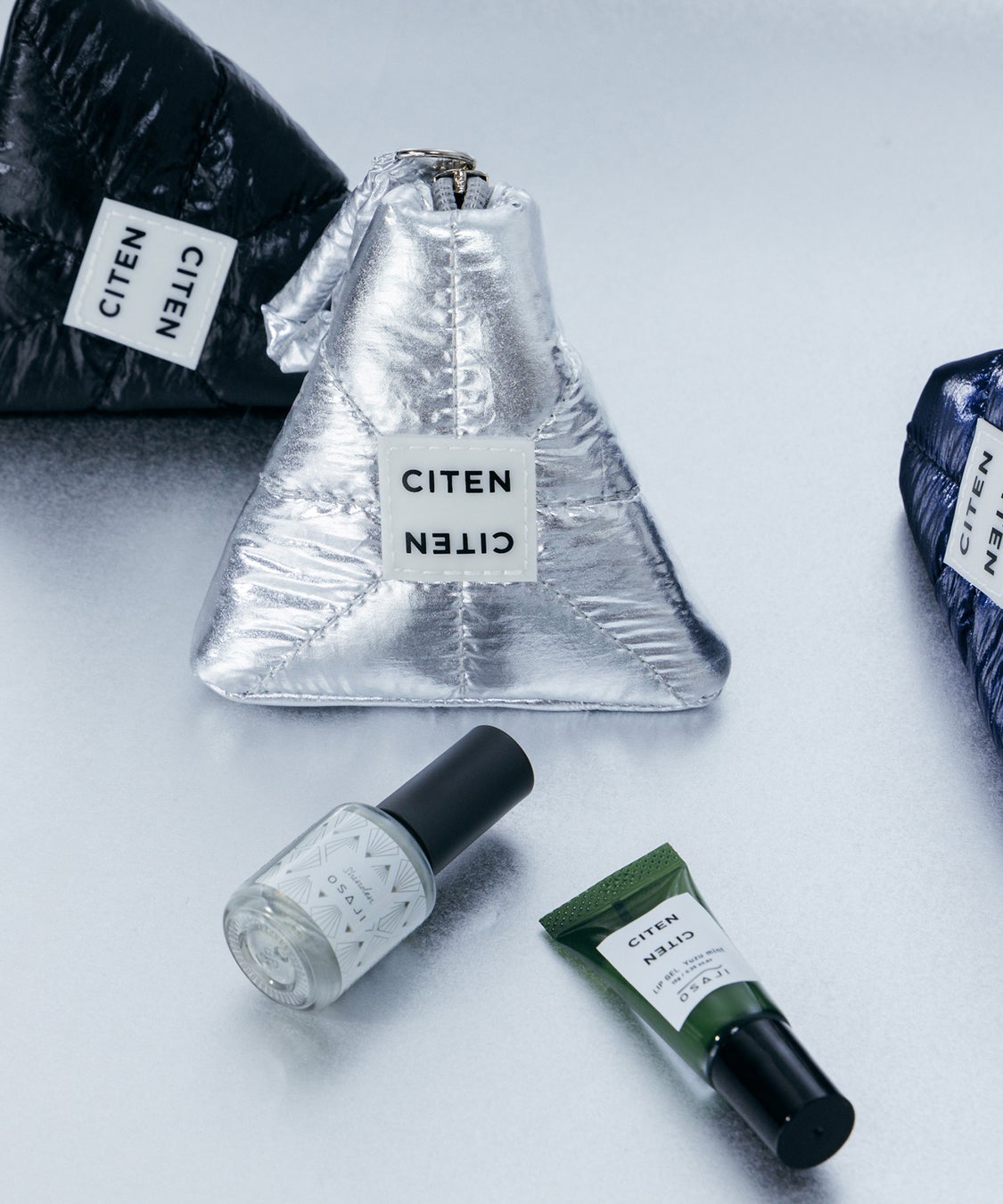「CITEN」人気のパテッドキルティング素材をネイルの美しい光沢感にあわせたメタリックカラーに仕上げ、「OSAJI」のブランドロゴの“A”から着想を得た立体ポーチ。