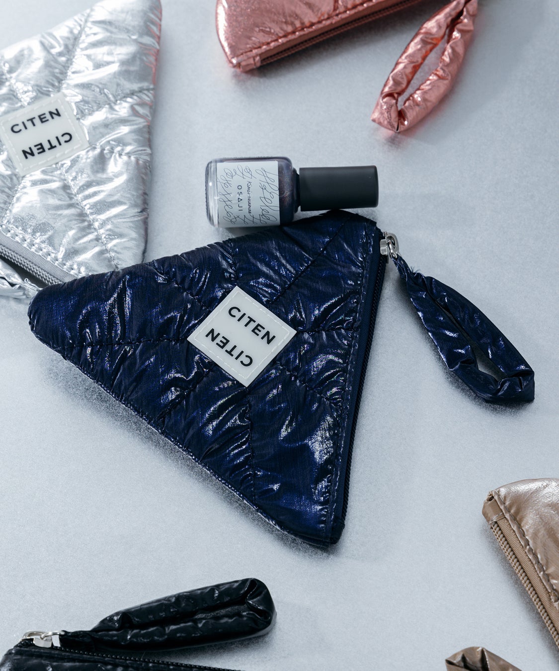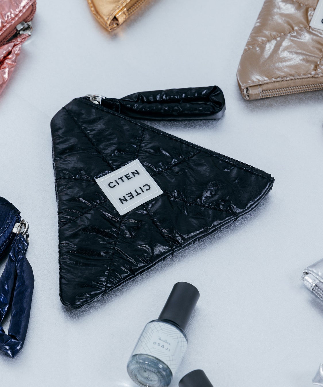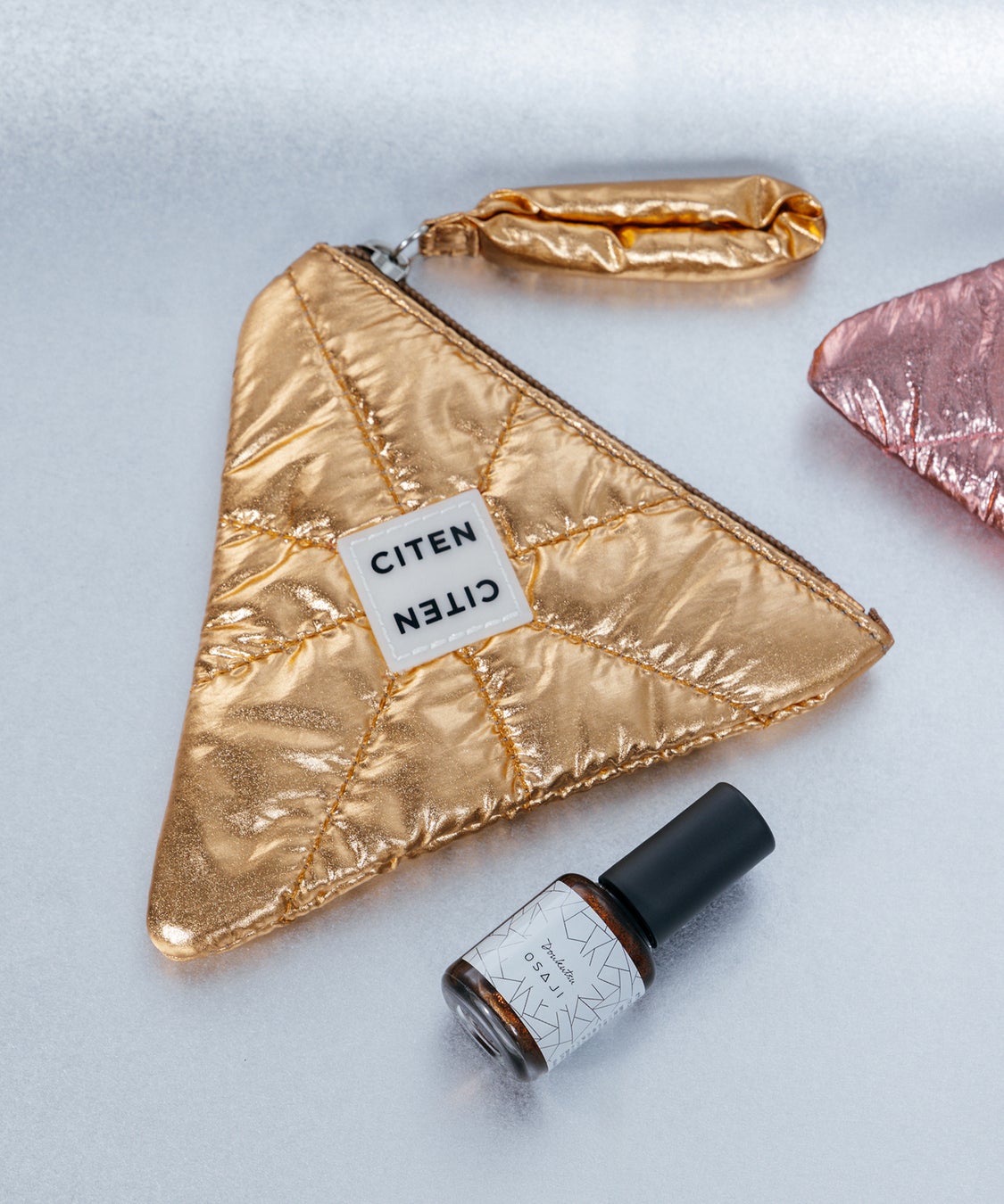 「CITEN」人気のパテッドキルティング素材をネイルの美しい光沢感にあわせたメタリックカラーに仕上げ、「OSAJI」のブランドロゴの“A”から着想を得たフラットポーチ。