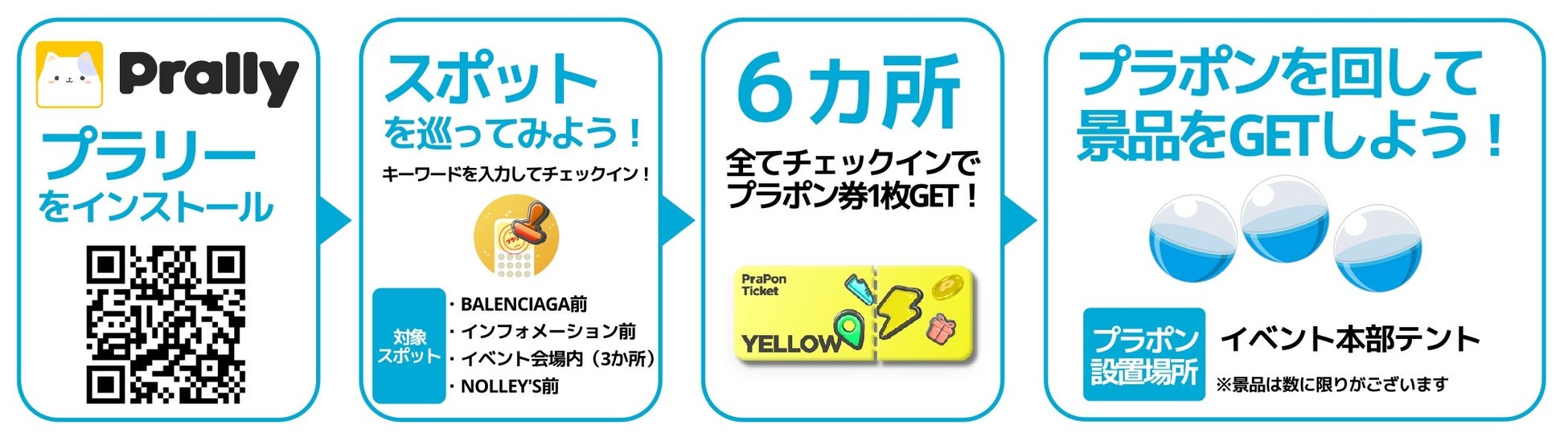 参加者はスマートフォンを使い、各スポットにチェックインし、ポスターに記載されたキーワードを入力することで、「プラリー」アプリ上でチェックインが可能です。