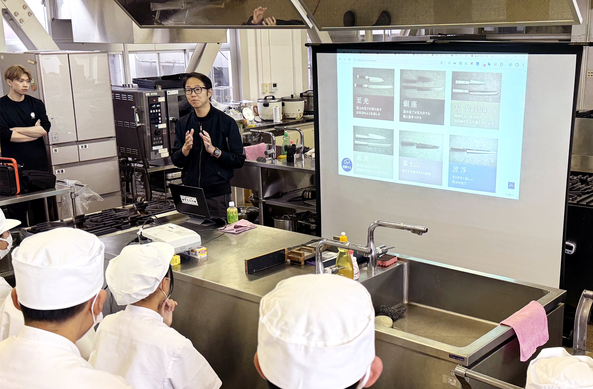 今回のワークショップは、徳島県立小松島西高等学校食物科の1年生2クラス(合計68名)を対象として実施。120年以上の歴史を持つ株式会社實光の包丁職人が講師となり、包丁の知識や研ぎ方に関する講義と実践講座が行われました。