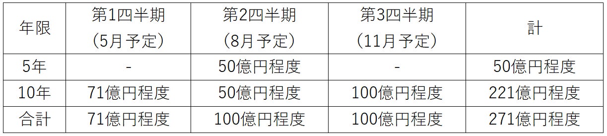 2025年度の鉄道・運輸機構債券の発行総額は271億円程度を予定しております。発行計画については、以下のとおり。(資金需要等により、調達額及び調達時期が変動する可能性があります)