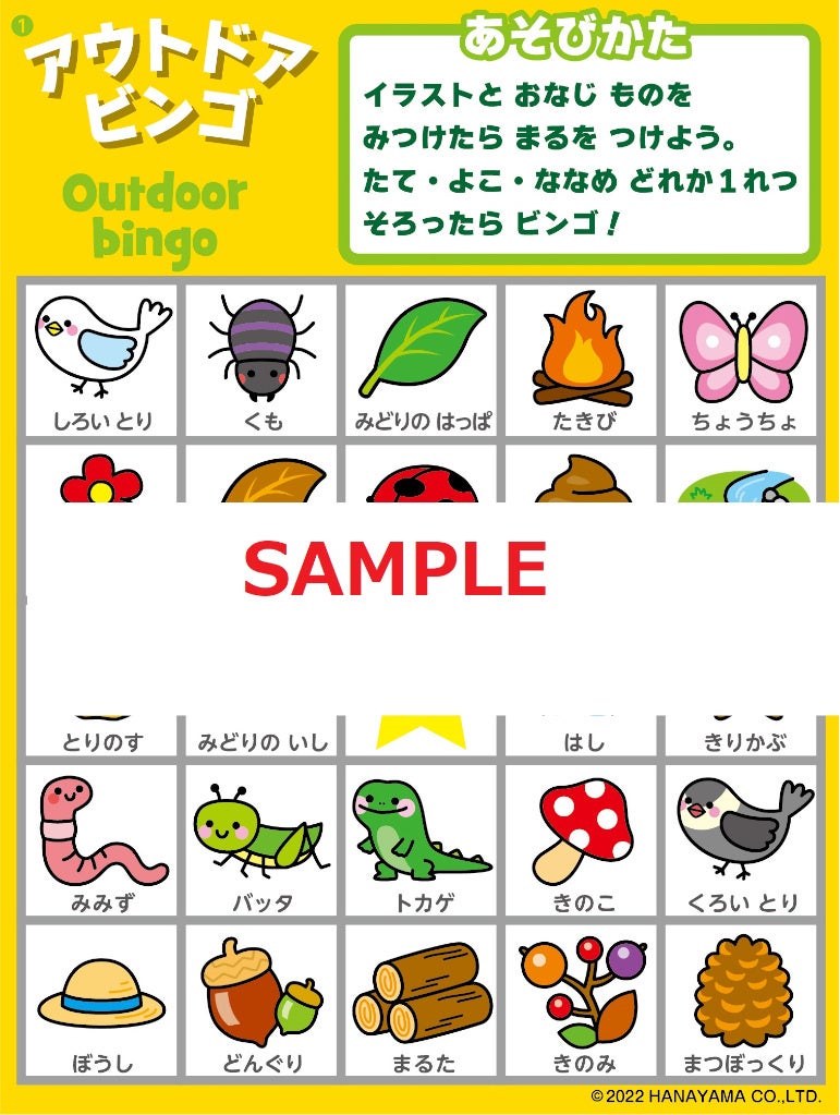 ④アウトドアビンゴ:公園内で観察できる生き物など、身近な自然のイラストが並んだビンゴゲームを、双眼鏡を使って行います。