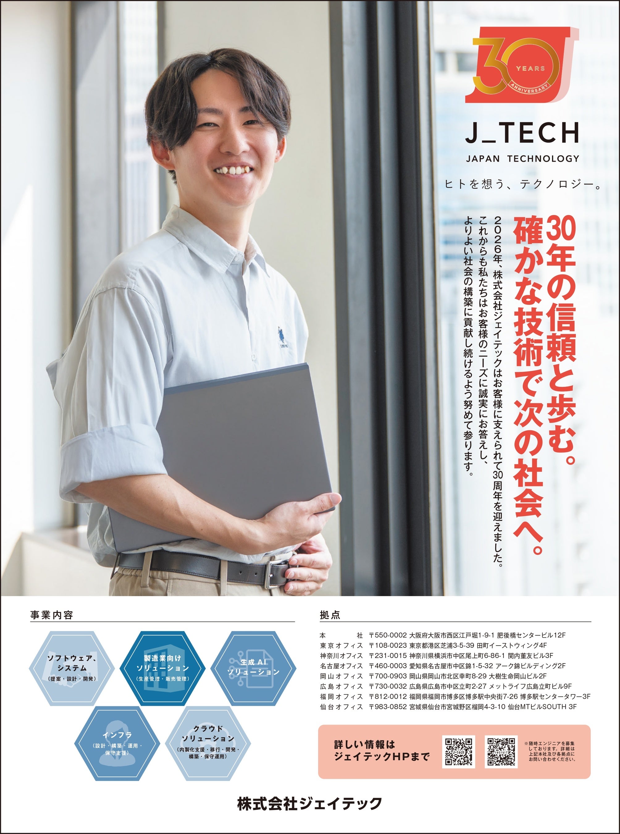 ソフトウェアを通して様々な情報サービス事業を展開する株式会社ジェイテック(以下「ジェイテック」)は、2025年10月をもって創業30周年を迎えたことにあたり、日頃よりご支援いただいているお客様、パートナー企業様、そして社員の皆様への感謝と、未来への決意を込めた新聞広告を2026年元旦に出稿いたします。