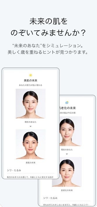 スキンケアを継続した場合と行わなかった場合の未来の肌を比較表示。