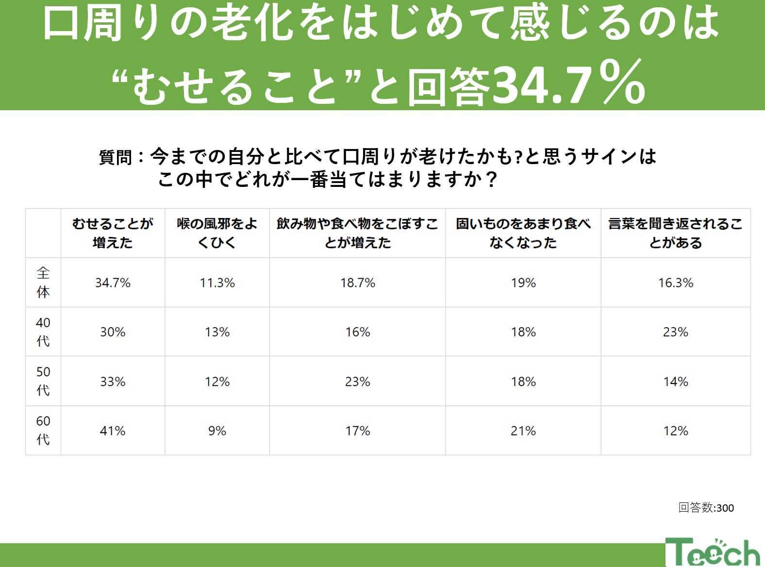 アンケートでは、「今までの自分と比べて口周りが老けたかも?と思うサインはこの中でどれが一番当てはまりますか?」という質問をしました。その結果、全体で見てみると、300人中34.7%の方が「むせることが増えた」と答えています。確かに、以前よりむせやすくなったなと感じたら要注意です。