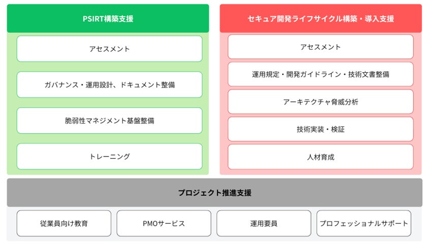 PSIRT構築やセキュア開発プロセス導入など複数施策を統合的に管理し、関係部門間の調整や課題解決を推進します。また現場の実情を踏まえた伴走型の支援により、プロジェクトを確実に前進させ、継続的な運用につなげます。
