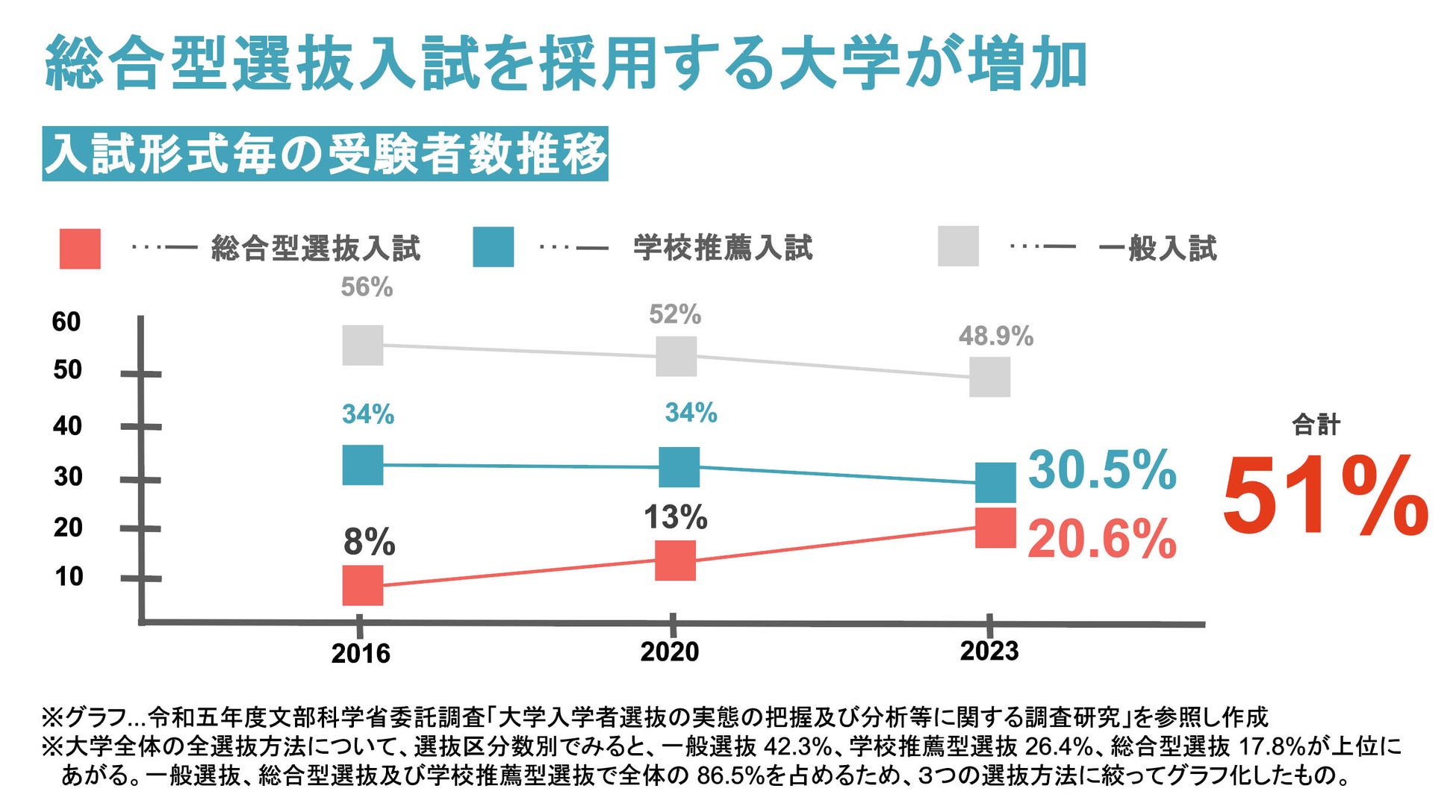なかでも総合型選抜の占有率の増加は著しく、2016年からの7年間で12.6%増加しています。多面的・総合的に評価される点や年内に合否が判明する場合が多い点が受験生を惹きつけていると考えられ、今後もニーズが高まっていくと予想されます。