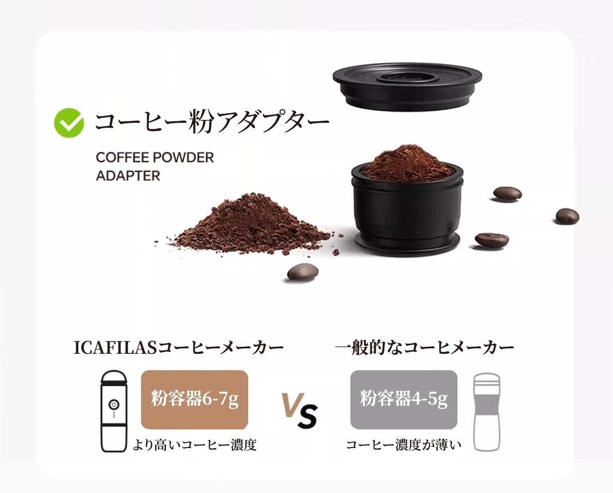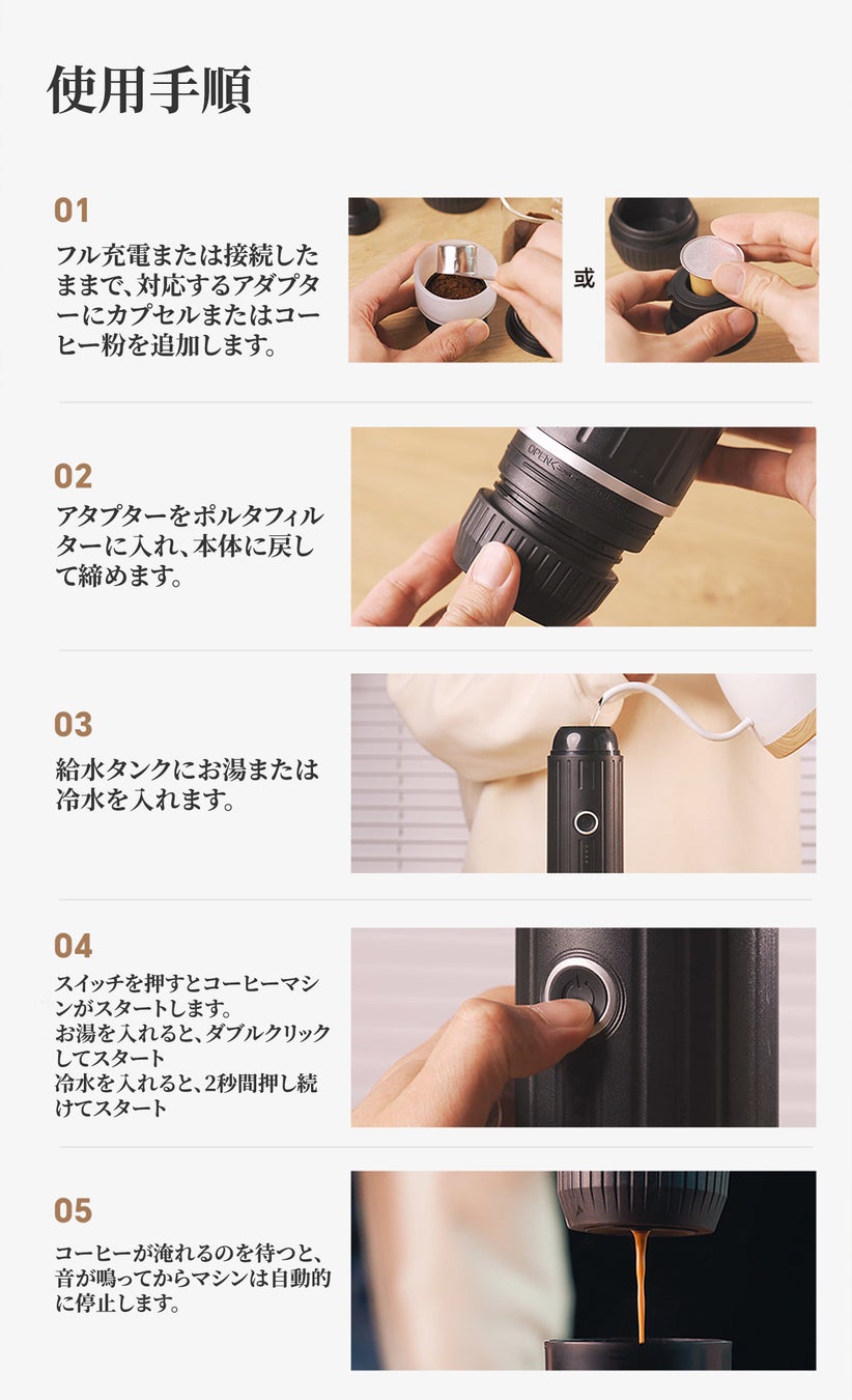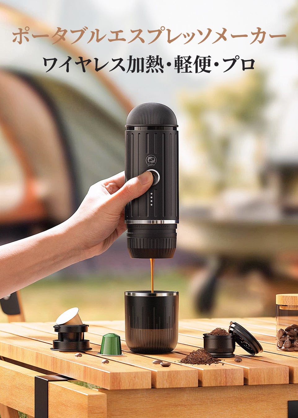 今こそ、携帯型エスプレッソマシンで、どこにいても極上のコーヒーをお楽しみください。毎日の生活に豊かな味わいとスタイルを加えるための完璧な選択です。ご自身へのご褒美に、または大切な人へのプレゼントにも最適です。