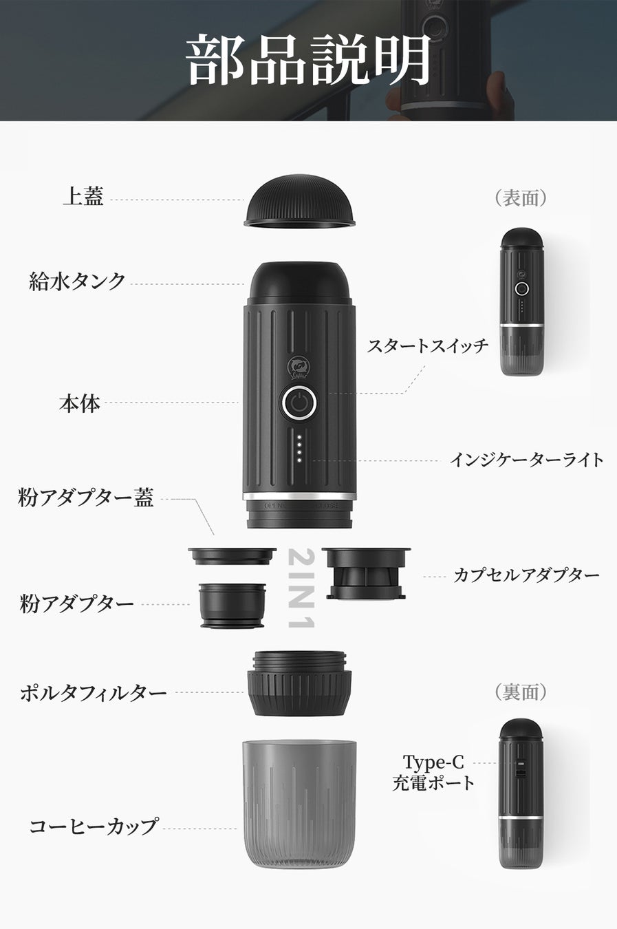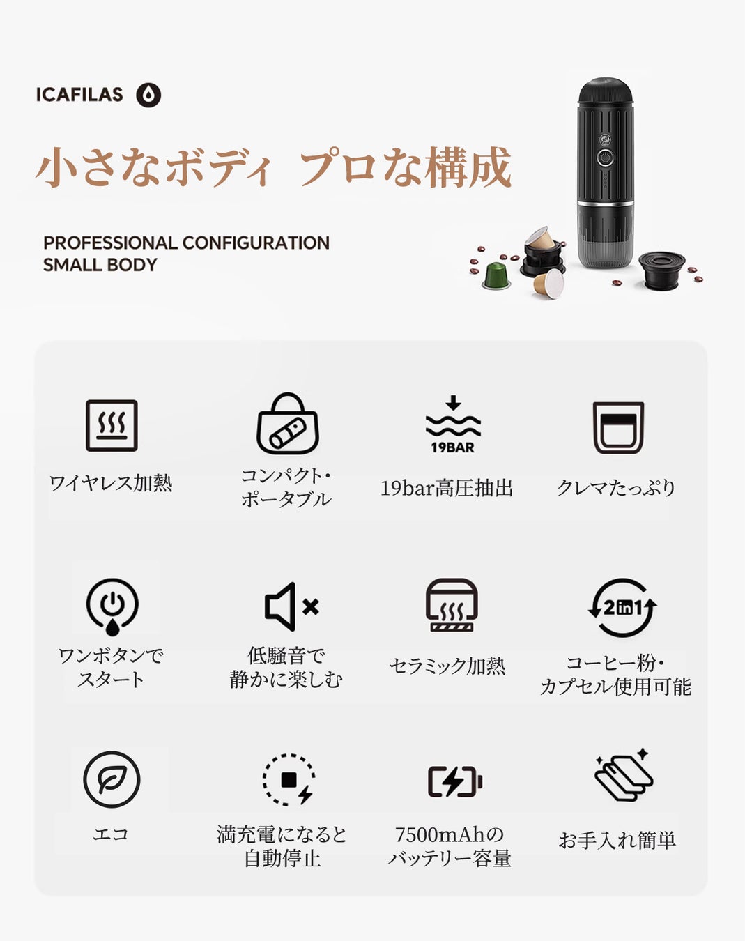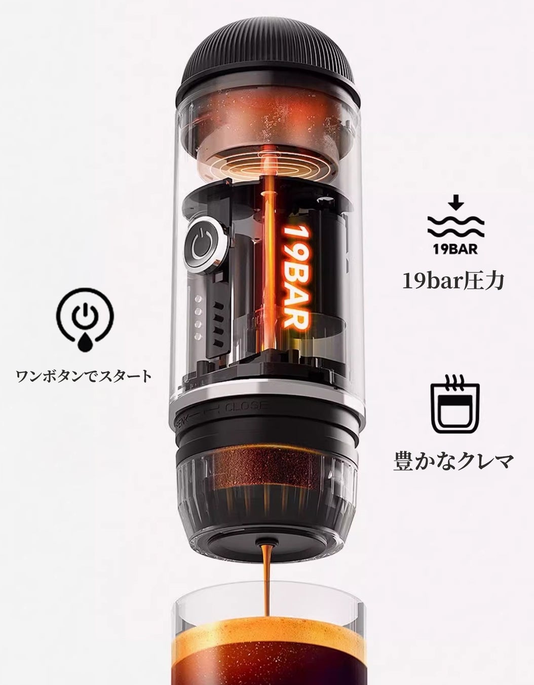 今こそ、携帯型エスプレッソマシンで、どこにいても極上のコーヒーをお楽しみください。毎日の生活に豊かな味わいとスタイルを加えるための完璧な選択です。ご自身へのご褒美に、または大切な人へのプレゼントにも最適です。