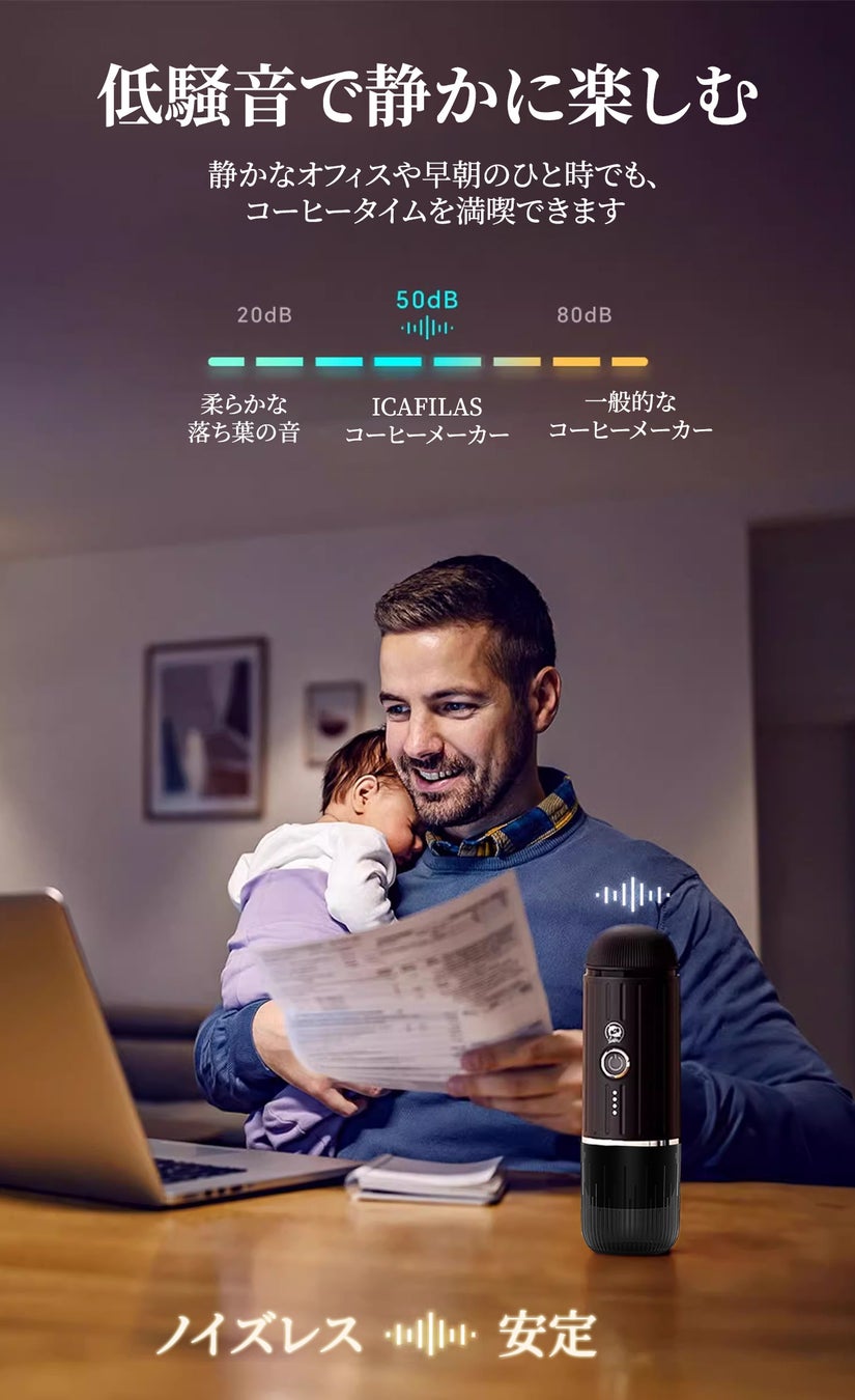 新型充電式エスプレッソメーカーは、2 IN 1設計でコーヒー粉とカプセルに対応。ワイヤレス加熱で常温水でも5分で抽出可能。静音設計で19barの高圧抽出を実現し、どこでもリッチなコーヒーを楽しめます。
