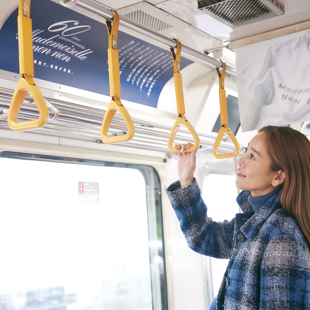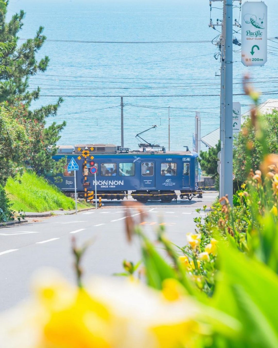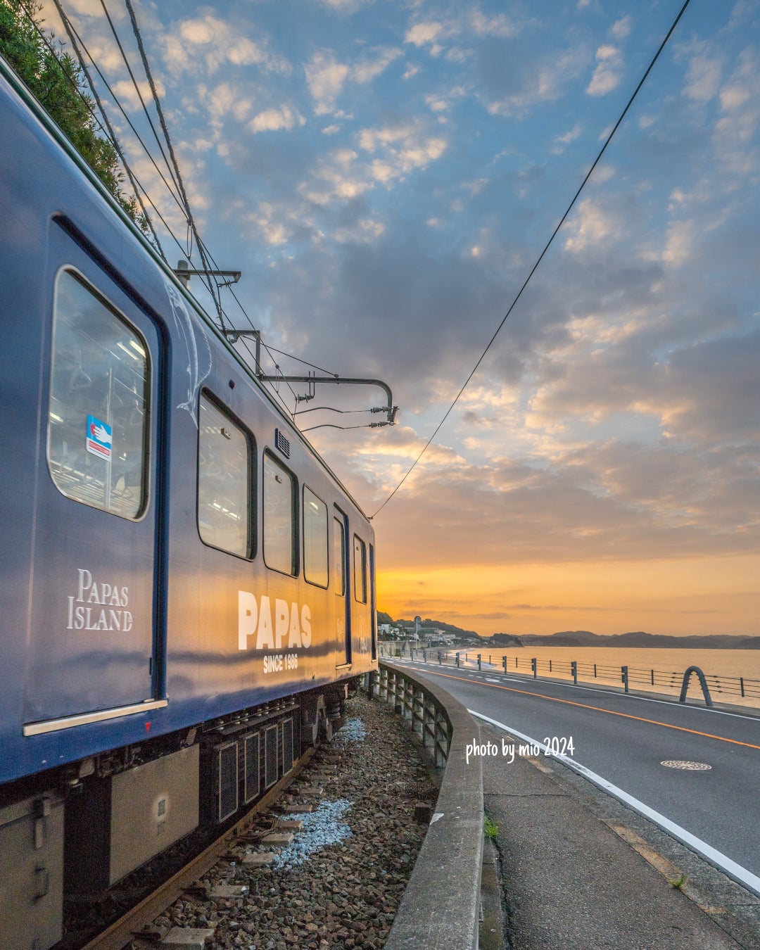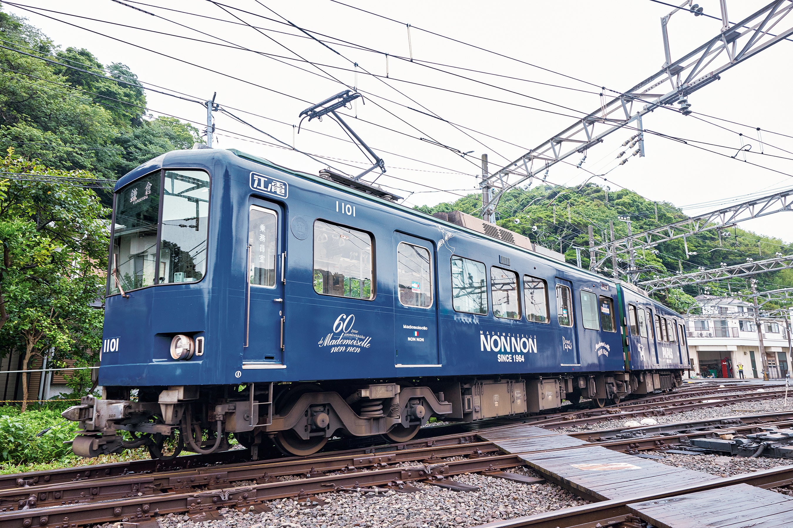 2024年7月より、江ノ電でレディースファッションブランド「マドモアゼルノンノン」とメンズファッションブランド「パパス」の特別なデザインを施したラッピング電車が運行しています。