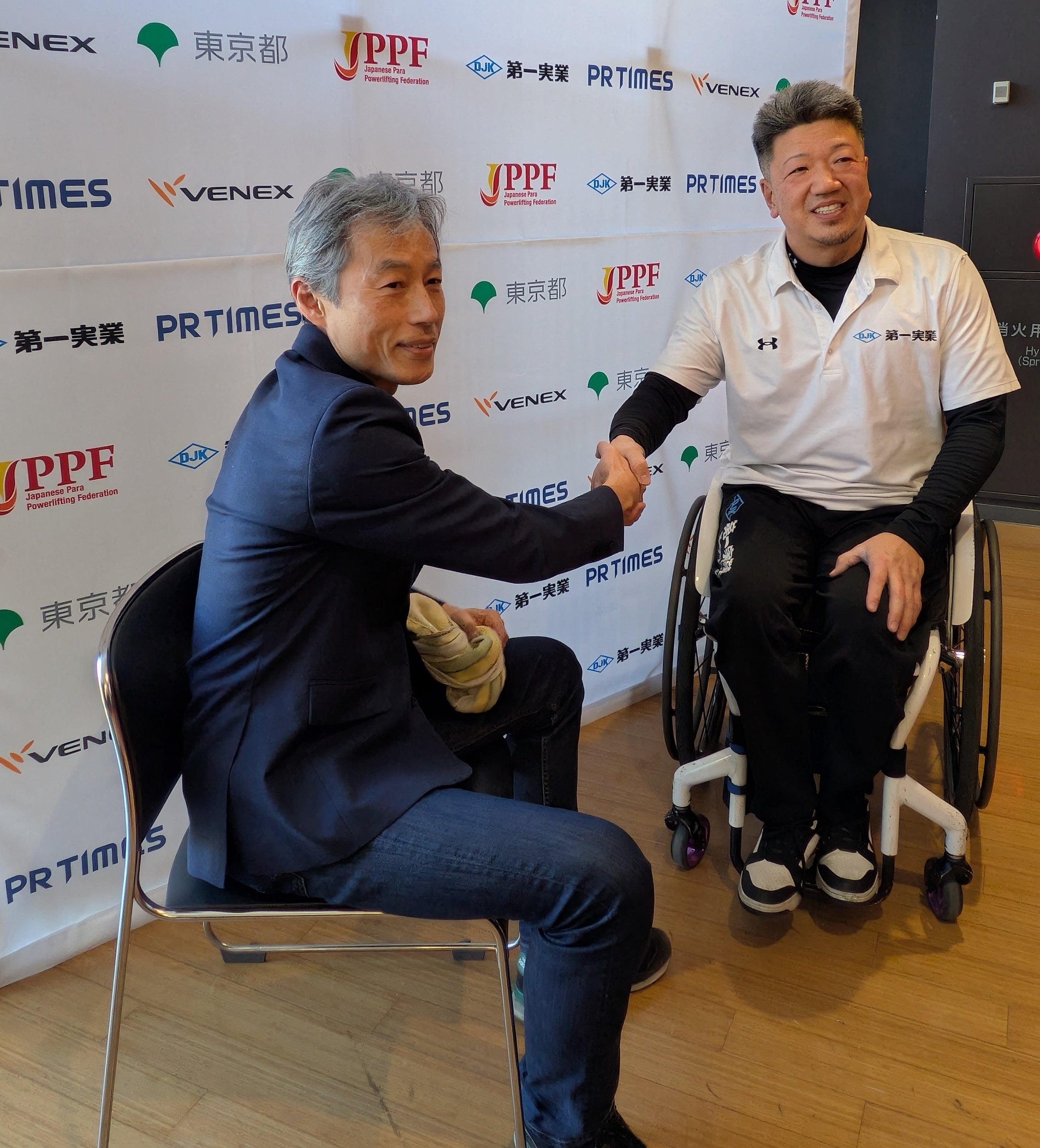 連盟オフィシャルパートナー(トップパートナー)である第一実業株式会社様からは、役員を含む社員とそのご家族合わせて約25名の応援団が来場。同社所属パラアスリート・石原正治選手の試技に対し、部署や役職の垣根を超えた大声援が送られました。表彰式後、バックボード前で行われた西井上席執行役員と石原選手の対談では、石原選手の「筋肉は 80 歳くらいまで育つんですよ」という言葉に、西井上席執行役員が身を乗り出して興味津々に耳を傾ける場面も。普段の業務とは異なる「アスリートとしての社員」の姿から経営層・同僚が日本記録へ本気の挑戦を目の当たりにし、世代や立場を超えて応援することで、組織のエンゲージメント向上と社内コミュニケーションの活性化に繋がりました。