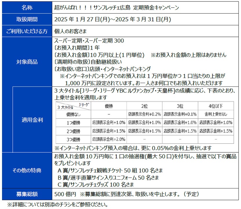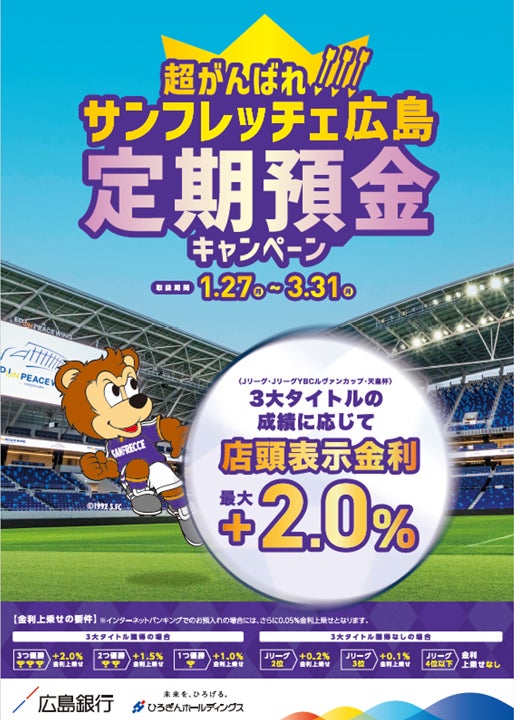 おいても、サンフレッチェ広島の活躍の後押しと地域の活性化へ貢献するため、定期預金キャンペーンを実施しますので、下記のとおりお知らせいたします。