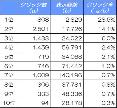 1位は約28.6%のCTRを獲得、上位3位まででCTRは大幅低下