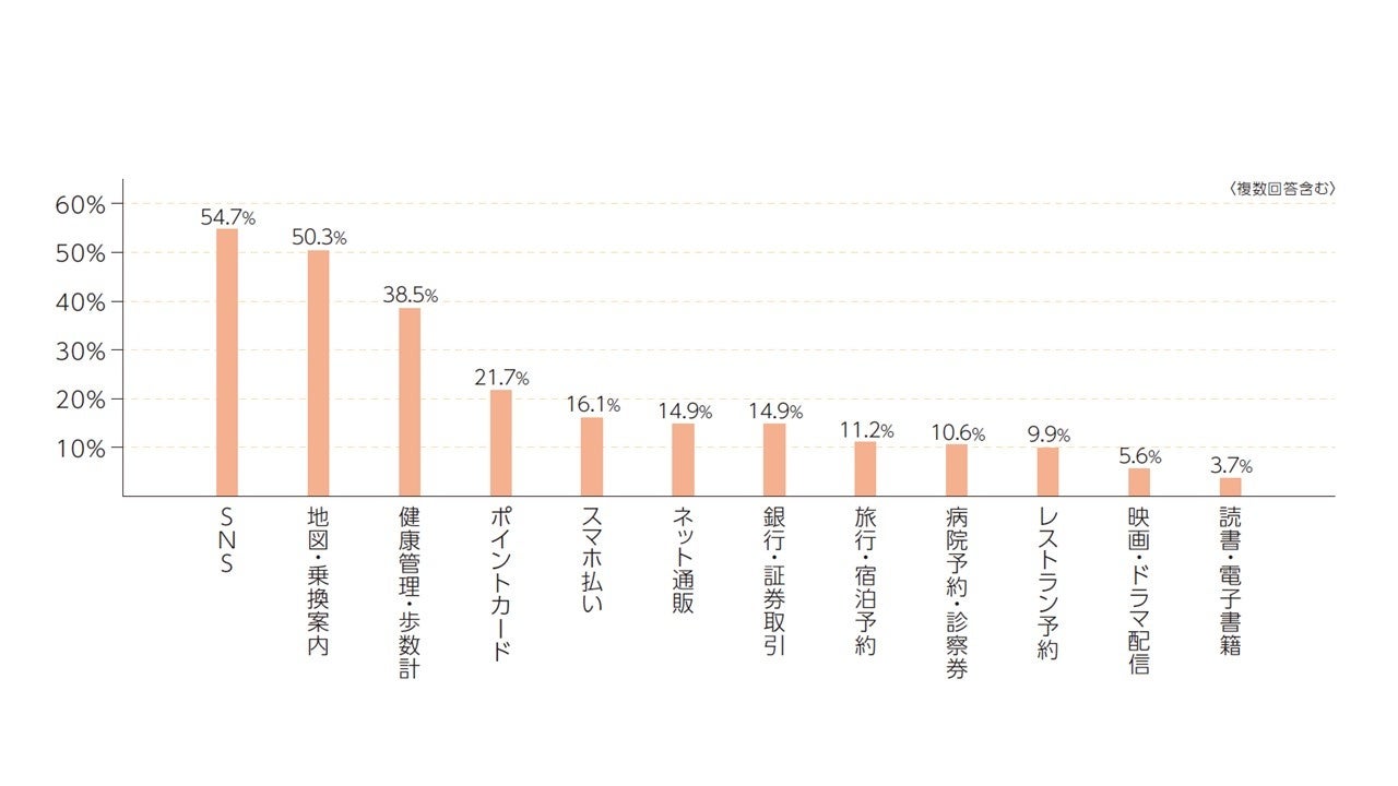 4.よく使うアプリは「SNS」が最多の54.7 % 、次いで「地図・乗換案内」50.3% 、