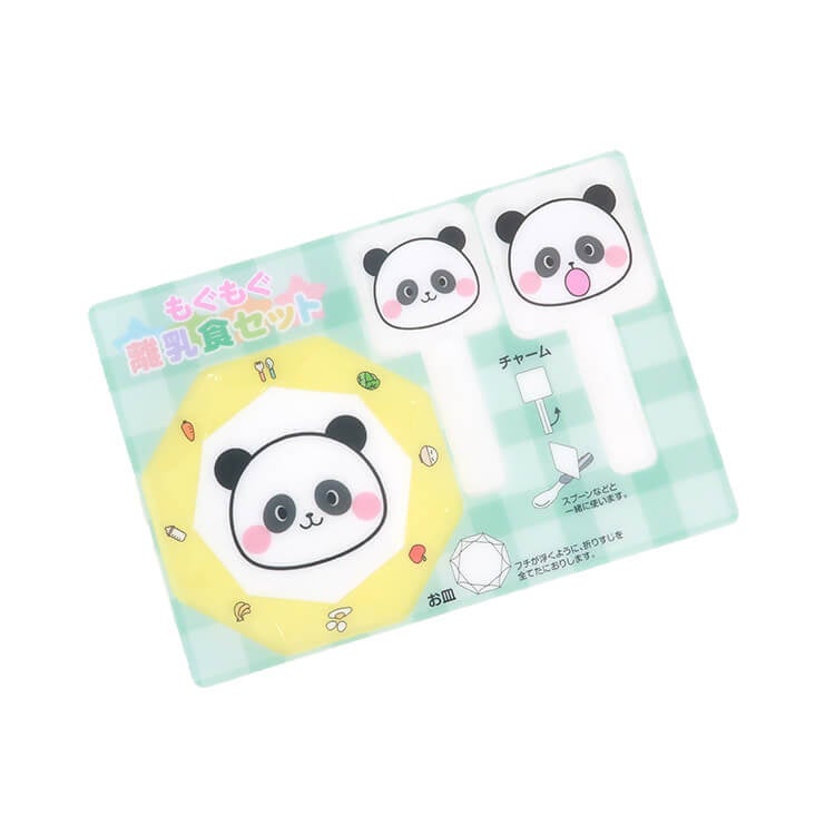 『もぐもぐ離乳食セット』はチャームとお皿のセットです。イヤイヤ期にたのしく食事ができることを目的に開発されました。全面フルカラー印刷可能で、キャラクターを入れたデザインがおすすめです。