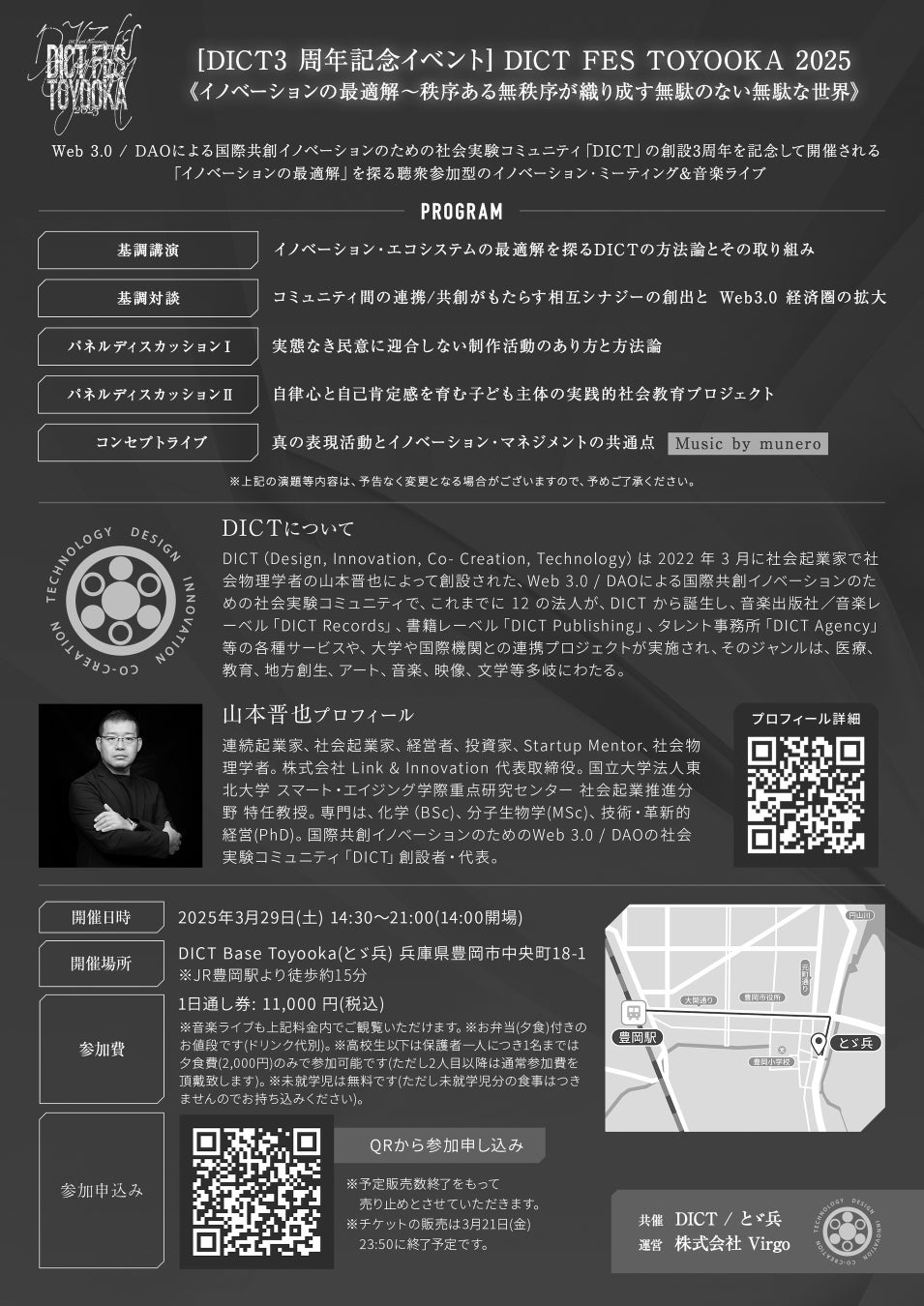 3月29日(土)に兵庫県豊岡市で開催されるイベント『DICT FES TOYOOKA 2025《イノベーションの最適解〜秩序ある無秩序が織り成す無駄のない無駄な世界》』は、DICTの創設3周年を記念したもので、12の法人をはじめ、多岐にわたるプロジェクト、大学との共創事例が誕生したDICTの、イノベーションを加速させる方法論/最適解、スキーム等を、各分野の専門家が登壇し共有するとともに参加者の皆さんとのディスカッションを展開します。また、この日のために書き下ろされたDICT3周年の為の音楽をはじめ、DICTの音楽制作に携わる一人である音楽家のmunero(ミューネロ)を迎えて、音楽制作とイノベーション・マネジメントの共通項を探る、山本晋也とmuneroによるディスカッション形式の、コンセプト・ライブを同時開催します。