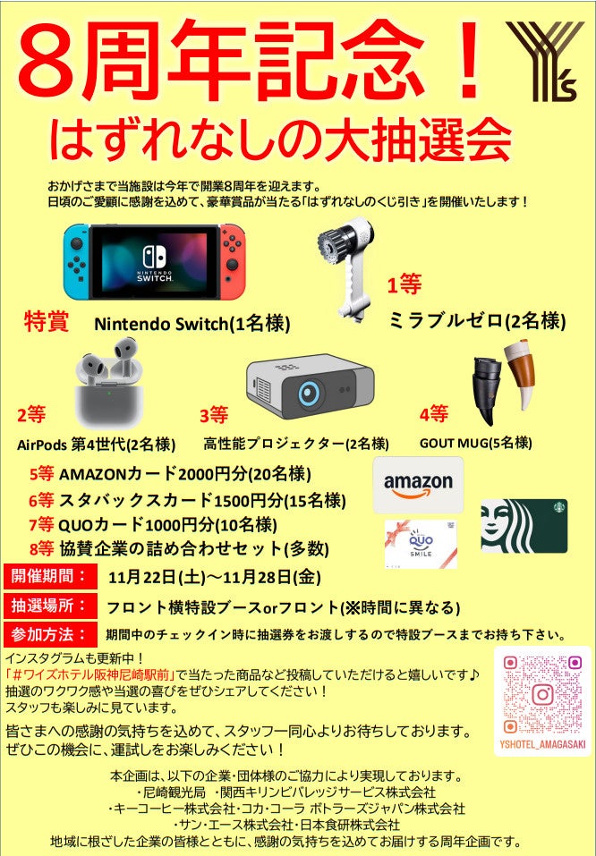 ワイズホテル阪神尼崎駅前(所在地:兵庫県尼崎市、運営:株式会社ワイズ 代表取締役社長 秋山新吾)は、2025年11月25日に開業8周年を迎えるにあたり、感謝の気持ちを込めた特別企画を実施いたします。期間限定の宿泊プラン「【8周年記念】朝食付き8,888円プラン」に加え、宿泊者全員が参加できる「はずれなしの大抽選会」も同時開催。地域の皆様とともに歩んできた8年間の節目を、笑顔と感謝で彩ります。