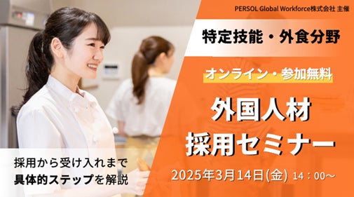 パーソルグループで外国人材に特化した人材サービスを提供するPERSOL Global Workforce(パーソル グローバルワークフォース)株式会社(本社:東京都港区、代表取締役社長:多田 盛弘)は、2025年3月14 日(金)に、特定技能・外食業分野の外国人材採用の無料オンラインセミナーを開催します。直近の外国人材採用市場の市況感から、具体的な採用フローなどを詳しくお伝えします。