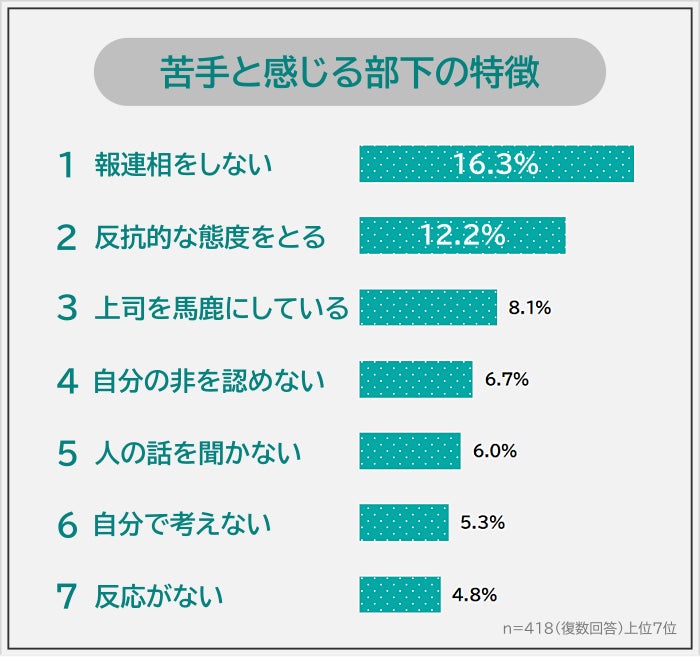 苦手と感じる部下の特徴を聞いたところ、1位は「報連相をしない(16.3%)」でした。2位「反抗的な態度をとる(12.2%)」、3位「上司を馬鹿にしている(8.1%)」、4位「自分の非を認めない(6.7%)」が続きます。