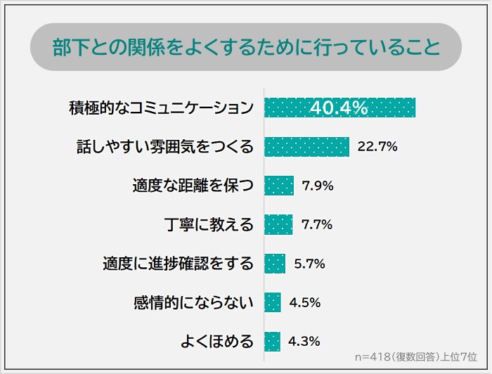 部下との関係を良くするために上司が行っていることを聞いたところ、圧倒的1位は「積極的なコミュニケーション(40.4%)」でした。2位「話しやすい雰囲気をつくる(22.7%)」も多くなりました。差が開いて、3位「適度な距離を保つ(7.9%)」、4位「丁寧に教える(7.7%)」が続きます。