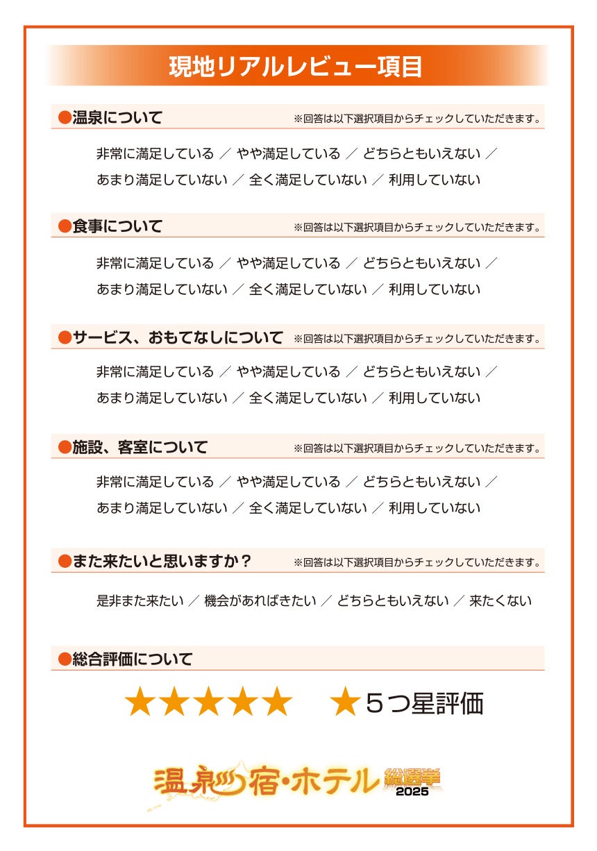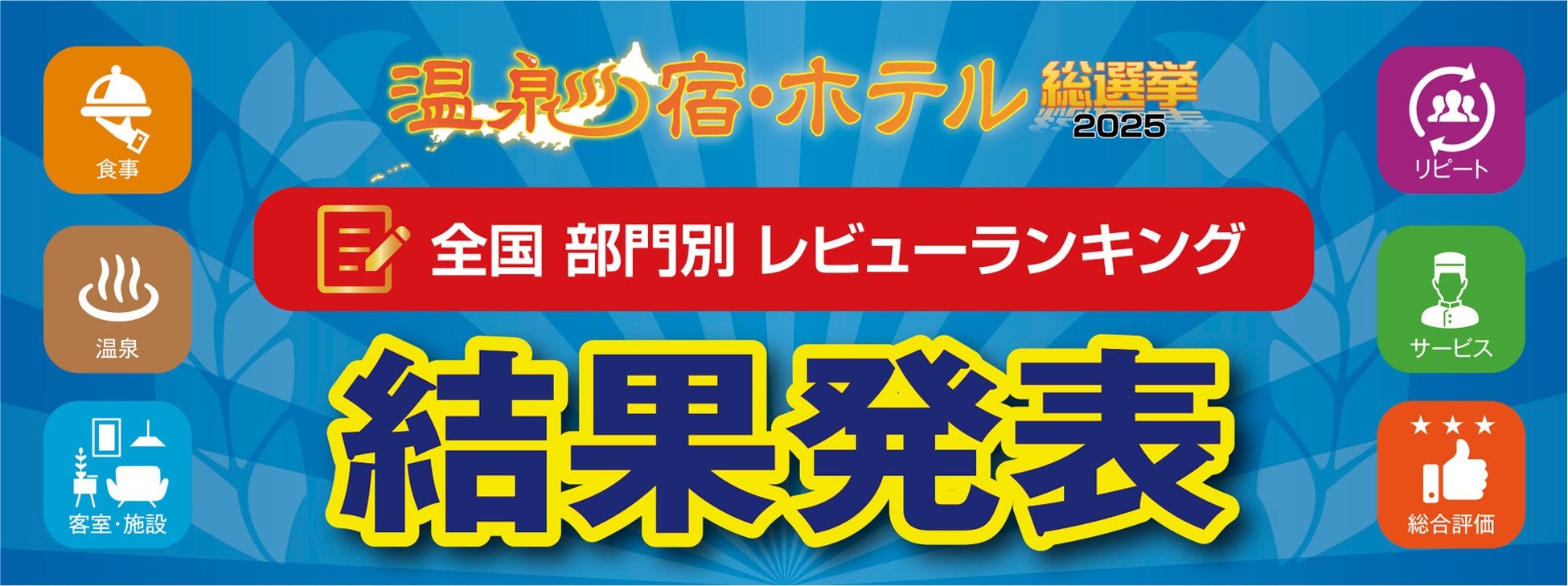 5省庁(環境省、内閣府、総務省、経済産業省、観光庁)の後援で温泉地のランキング企画を実施している温泉総選挙(主催:旅して日本プロジェクト、運営事務局:一社)ジャパンデザイン、本社:東京都渋谷区、温泉総選挙総合プロデューサー/社会起業家:山下 太郎)が主催し実施する温泉宿・ホテルランキング企画「温泉宿・ホテル総選挙2025」にて、3万136人の応援投票の中から、5,987人の現地レビュー結果から選ばれた「全国リアルレビューランキング」部門別1位~5位を2025年11月28日10時に公式サイト内にて発表しました。