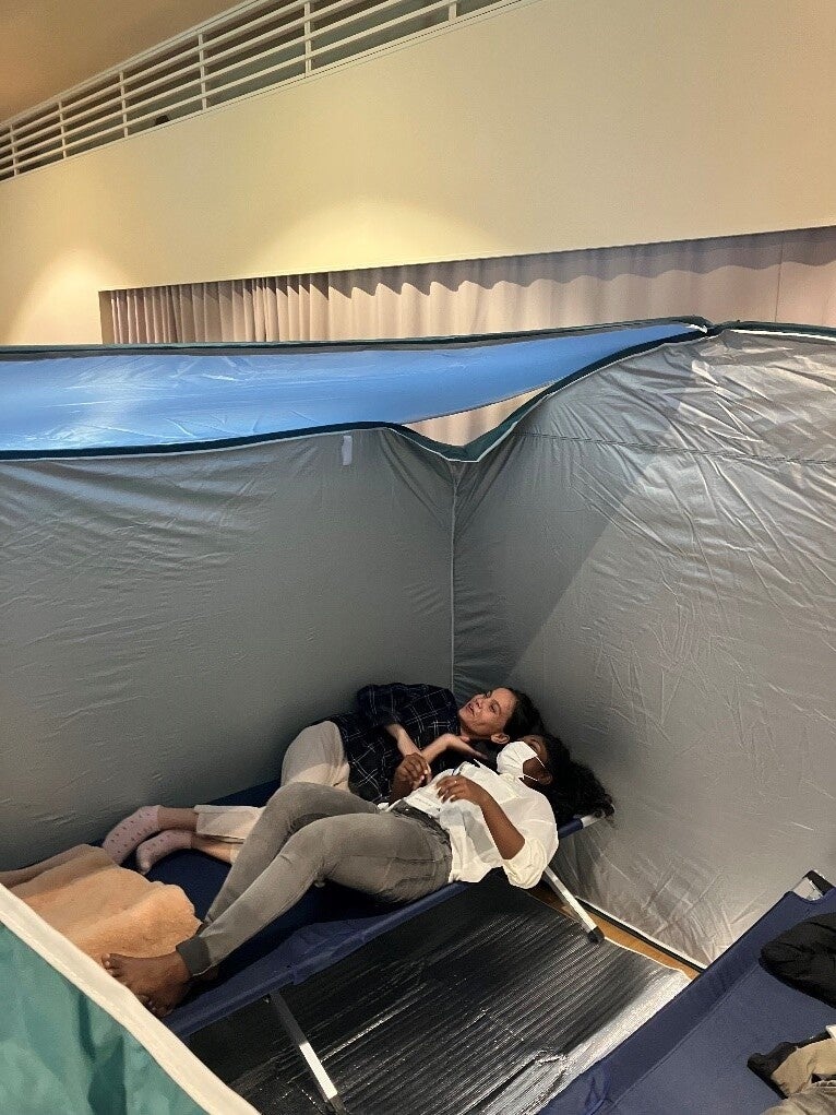 避難所の設営や生活を学ぶ / 避難所体験会 / ベッドやテントの設営、自動ラップ式トイレの講習、災害食の実食