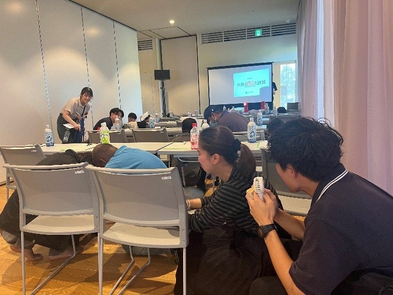 日本語学校と連携した取り組みの中で見えてきたのは、外国出身の人の中には、地震の概念がなく、地面が動くこと自体が理解できない人もいることです。また、日本人なら誰でも知っている、命をまもるための行動「机の下にもぐる」は必ずしも当たり前ではありません。昨年9月に実施した避難所体験会では、大阪880万人訓練の緊急速報メールの着信にあわせ、机の下に隠れるシェイクアウト訓練も実施しましたが、1回目ではうまくできず、2回目を実施することになりました。