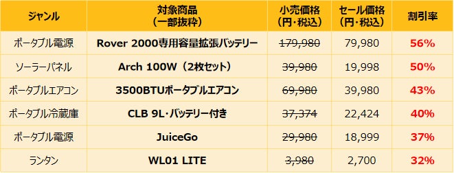 ポータブル冷蔵庫、ポータブルエアコン、ソーラーパネル等幅広い商品が、最大56%OFFとなり、最大で100,000円値引きをご利用いただけます。特に、今年新発売された製品も最大43%OFFの対象となっております。