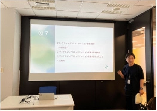 まず、管理部より弊社の生い立ちやMVV、ブランドプロミス「想いによりそうパートナー(以下「想パ」)」などの会社説明をいたしました。その後、豊洲オフィスにて懇親会が行われました。また、部長陣から各部署の概要や各部のMVVに対する想いをご説明し、全社理解をより深めました。