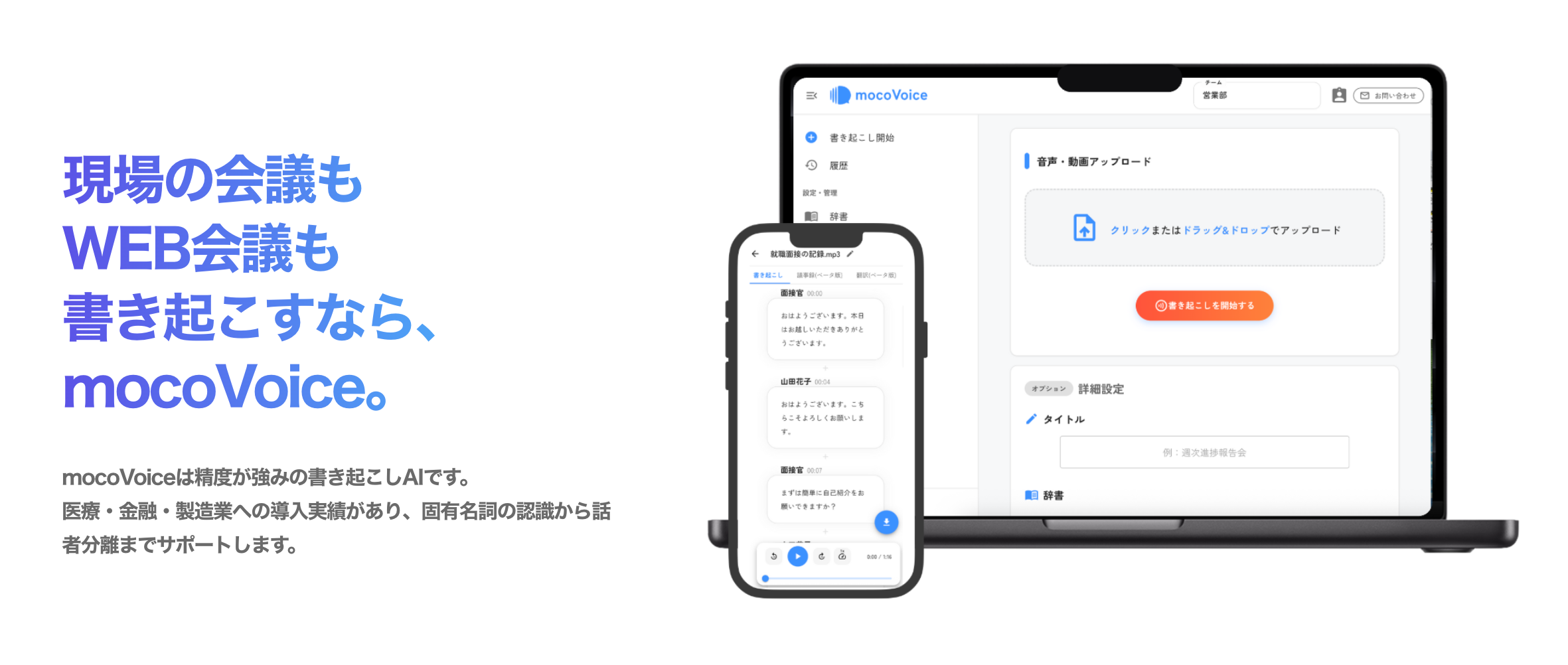 mocoVoiceは、会議・講義・インタビューなどの音声や動画を高精度かつ高速にテキスト化するAIサービスです。