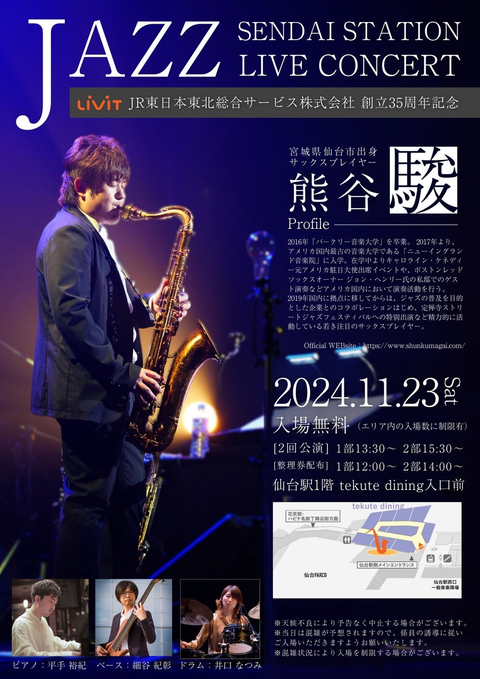 本年8月に創立35周年を迎えたJR東日本東北総合サービス株式会社(本社:宮城県仙台市、代表取締役社長:松木茂、以下「LiViT」)は、地域への感謝の気持ちを込めた記念イベントとして、LiViTが運営する仙台駅西口1階tekuteせんだいの飲食エリアとして同年3月にオープンしたtekute dining前でジャズライブを開催。仙台市出身のサックスプレイヤー熊谷駿さんらプロ演奏家による演奏をお届けします。