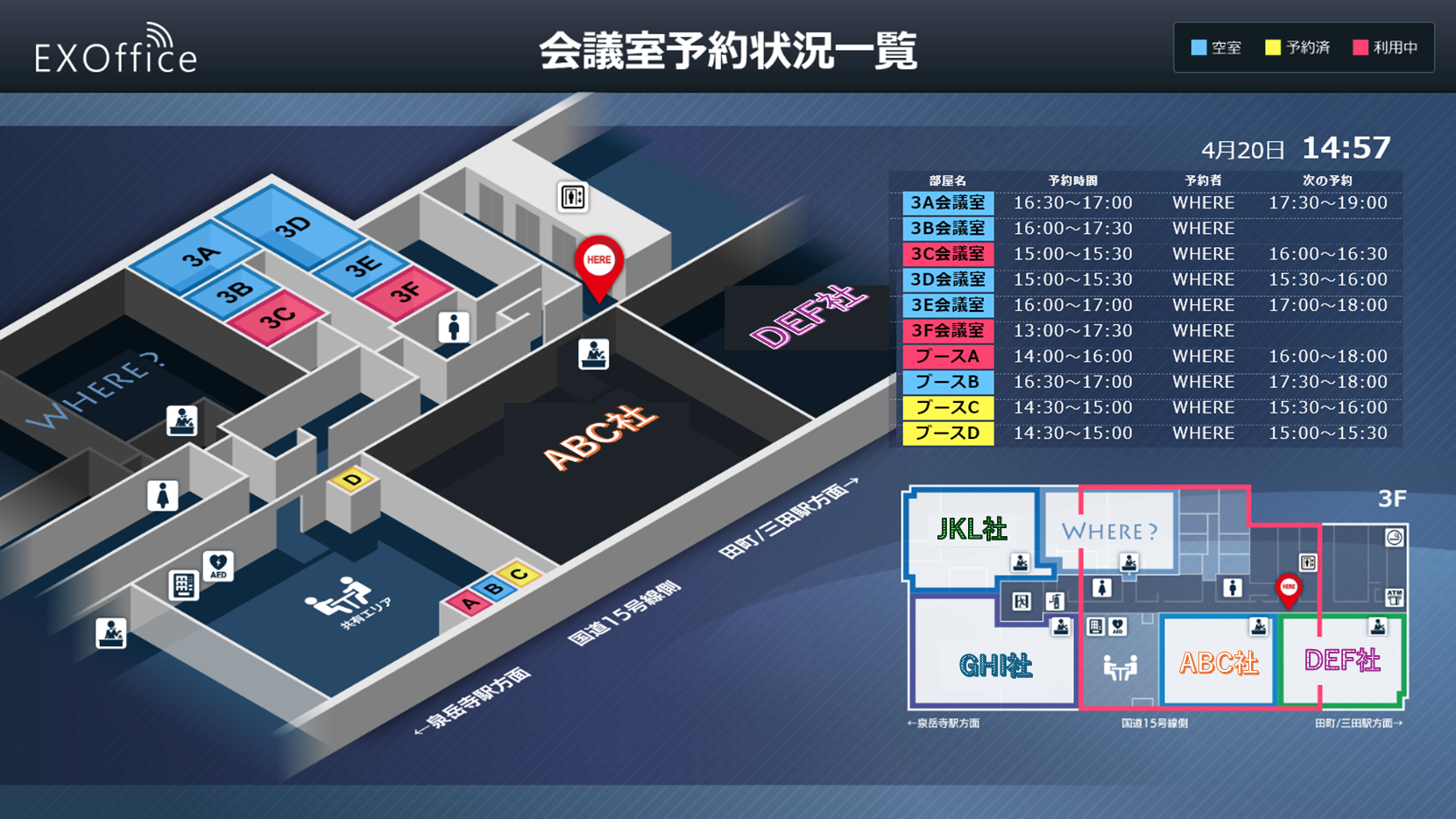 屋内位置情報ソリューションを展開する株式会社WHERE(本社:東京都港区、代表取締役:岩井 光久)は、スマートオフィスソリューション「EXOffice」のプレミアムサイネージサービスにおいて、従業員の居場所や勤務状況をリアルタイムに可視化する、新たなデザインラインナップを追加しました。