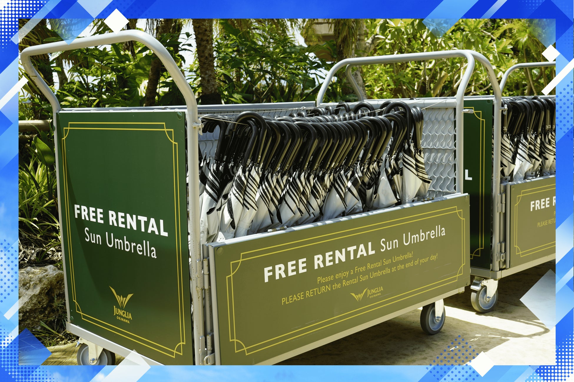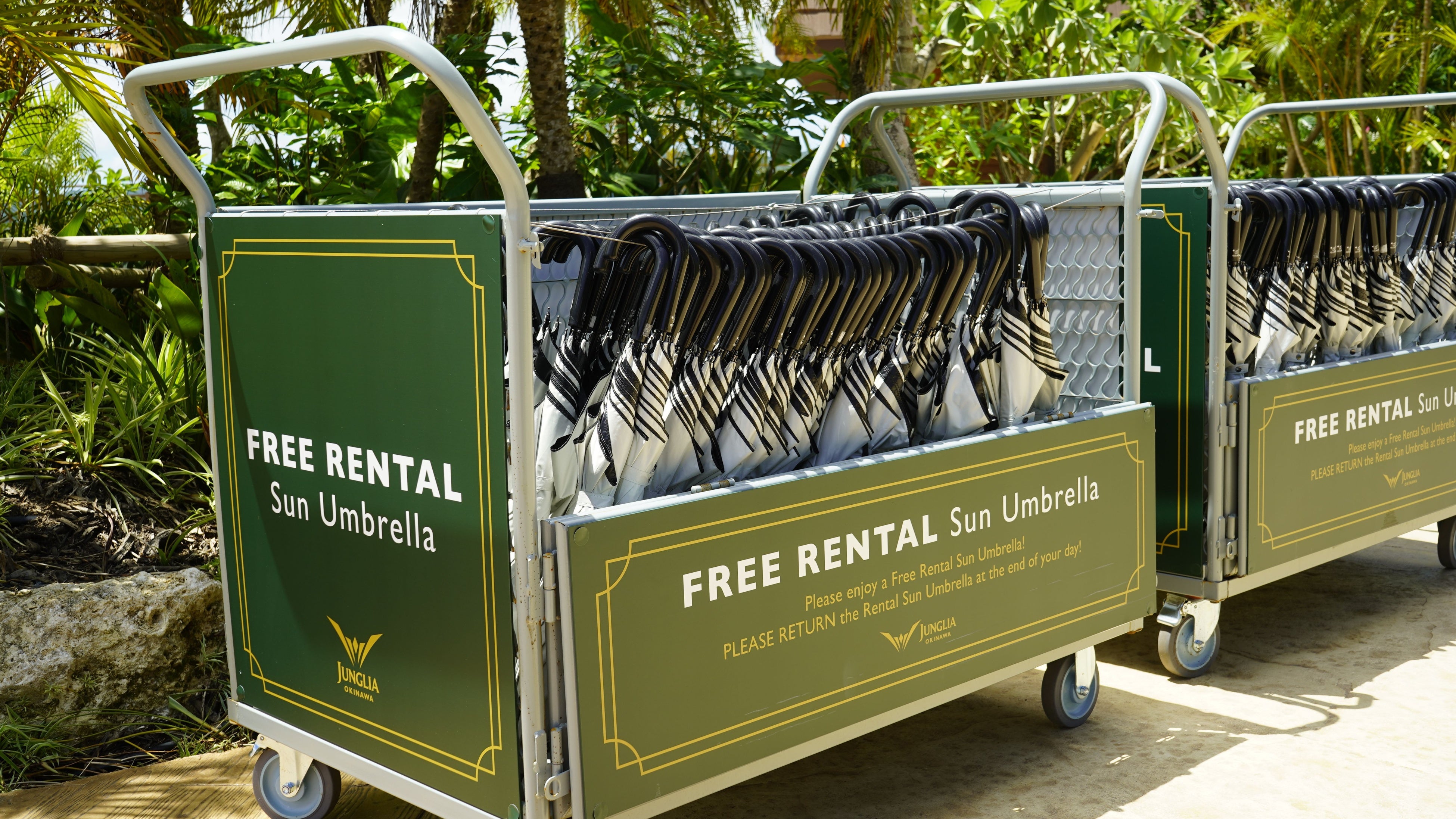 ゲストの熱中症・紫外線対策として有効な晴雨兼用の無料のレンタル「日傘」を、これまでご用意しておりました。今回、ビオレのご協力により、新規追加を含めた5000本以上の日傘をご用意します。日傘には、ビオレとジャングリア沖縄のロゴをあしらっています。「日傘カート」(16台)もリニューアル設置し、パーク内のゲスト導線を考慮のうえ、3か所に追加設置し、「快適性」を向上させます。