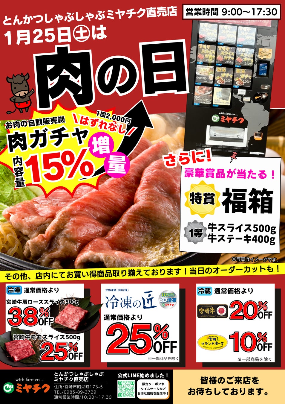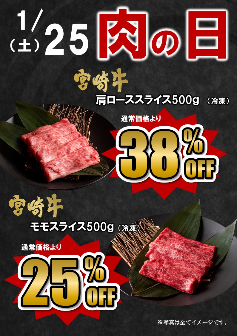 株式会社ミヤチク(本社:宮崎県都城市/代表取締役社長:船ヶ山 祐二)が運営する「宮崎牛」「宮崎ブランドポーク」「ハム・ソーセージ」を取り扱う直売店(宮崎県内3店舗)にて、1/25(土)にお肉が割引価格でお買い求めいただける「肉の日」を開催します。