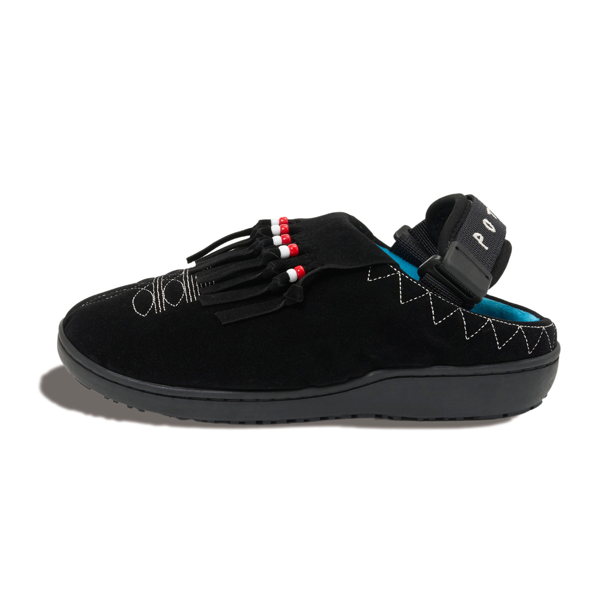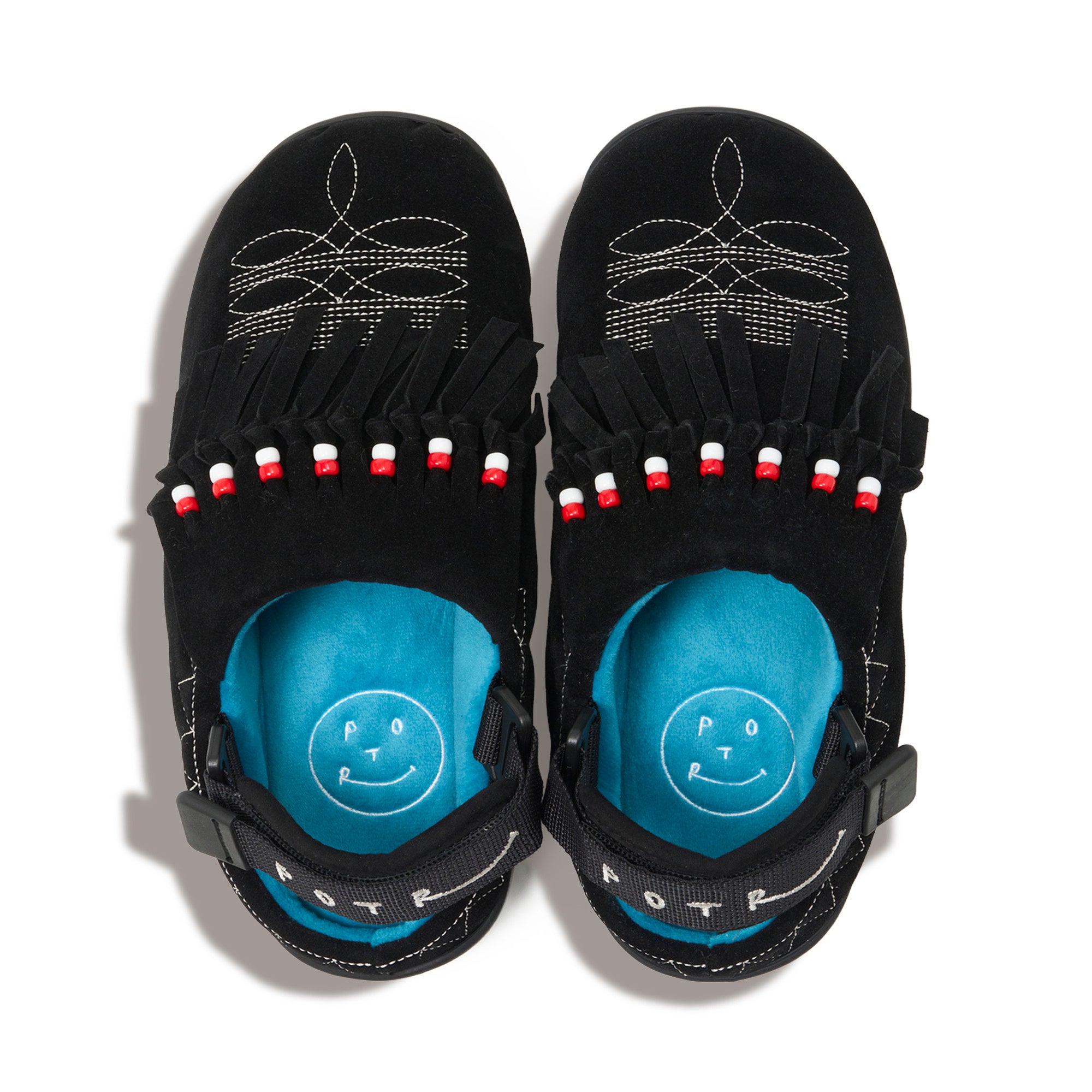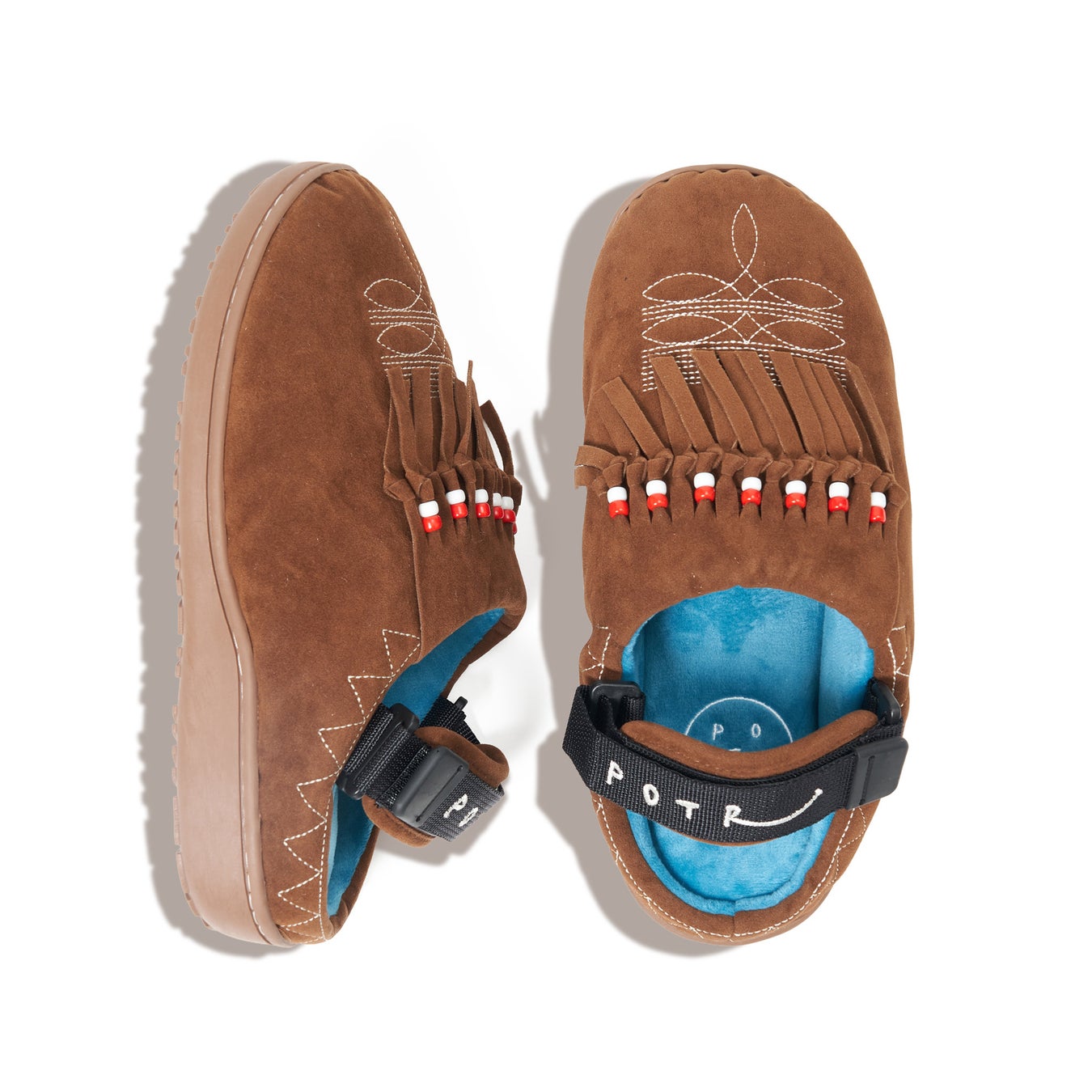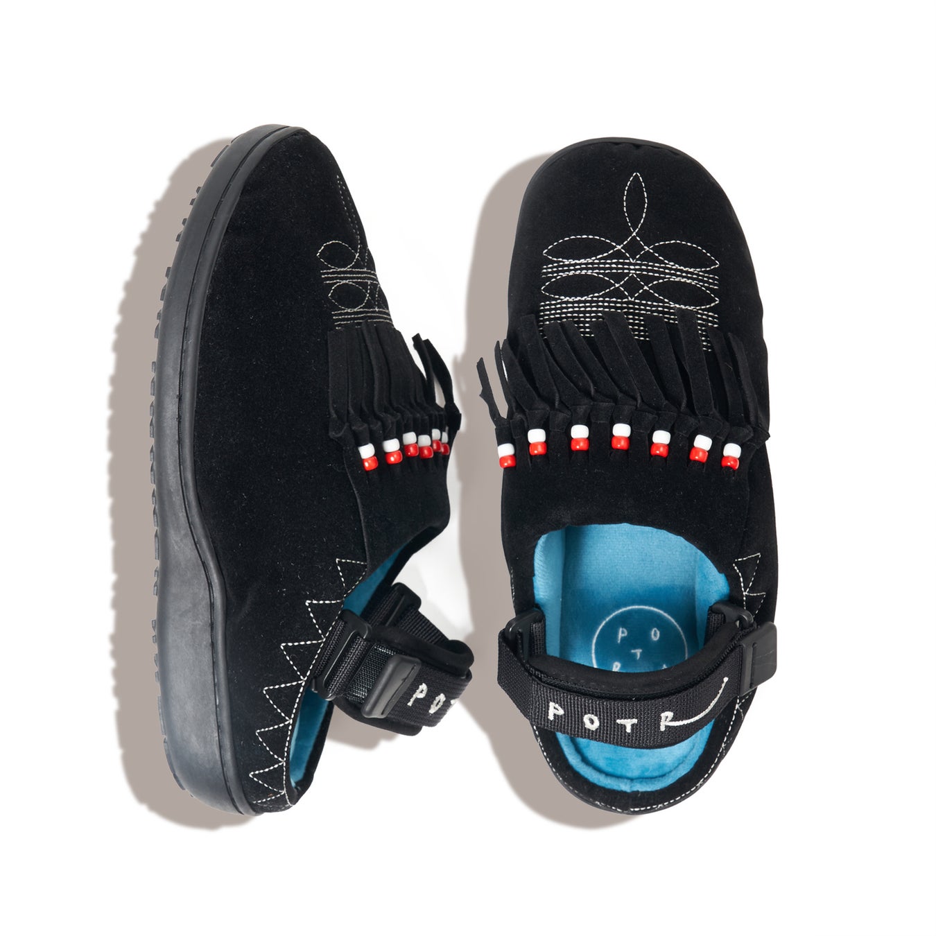 ネイティブアメリカンならではのフリンジや刺繍、ビーズを施し、フットベッドにはPOTRを象徴するターコイズブルーを採用しました。