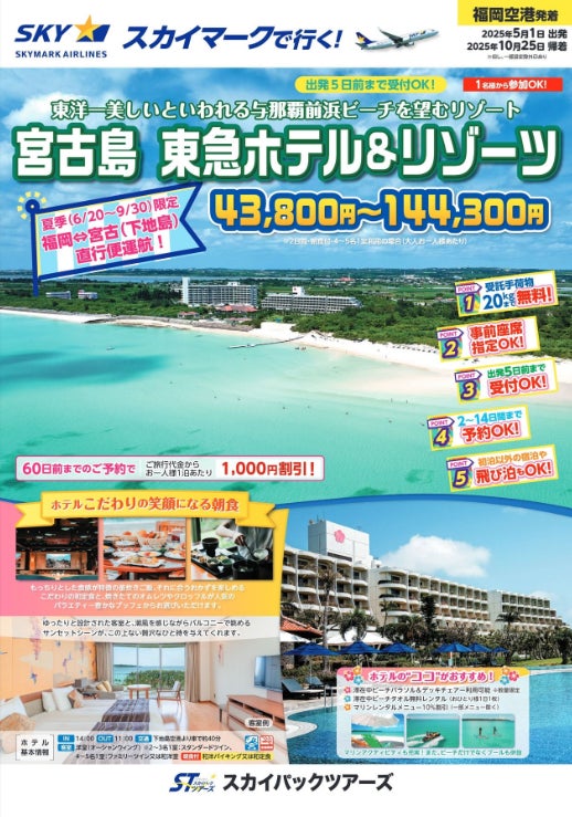 スカイパックツアーズ株式会社(本社:東京都中央区、社長:横山正巳)は、スカイマークを利用した価格固定型のパンフレット旅行商品「スカイマークで行く!宮古島 東急ホテル&リゾーツ」【福岡空港発着】(2025年5月1日出発~10月25日帰着)の販売を開始します。