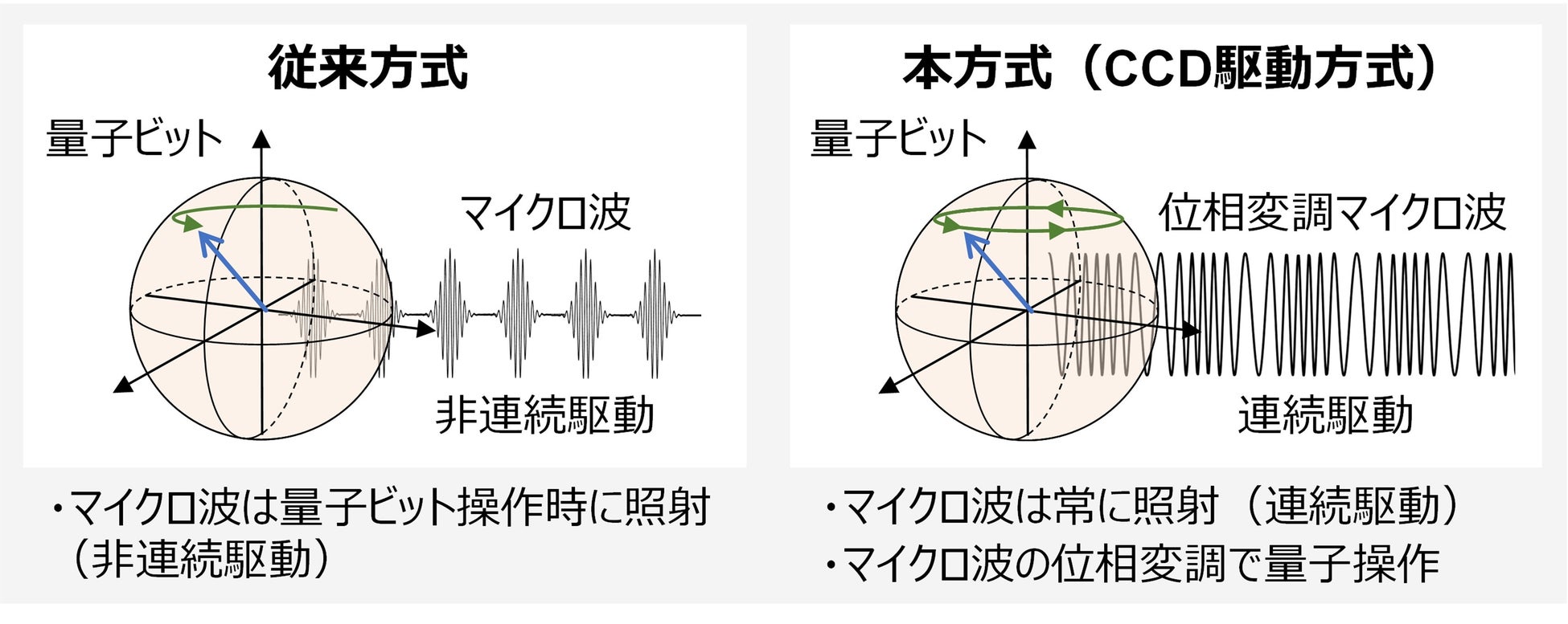 今回日立は、このCCD方式をさらに発展させ、マイクロ波を常時照射する「連続駆動」とマイクロ波の位相制御を組み合わせることで、量子ビットの状態を保持したまま高忠実度な操作(量子ゲート演算)が行えることを実証しました(図2)。さらに、量子操作の忠実度は従来の95%から99%以上へと大幅に向上したことを確認しました。この成果は、多数の量子ビット集積時にも高い計算信頼性を維持できる基盤となり、量子コンピュータの社会実装に向けた技術的進展を強く後押しするものです。