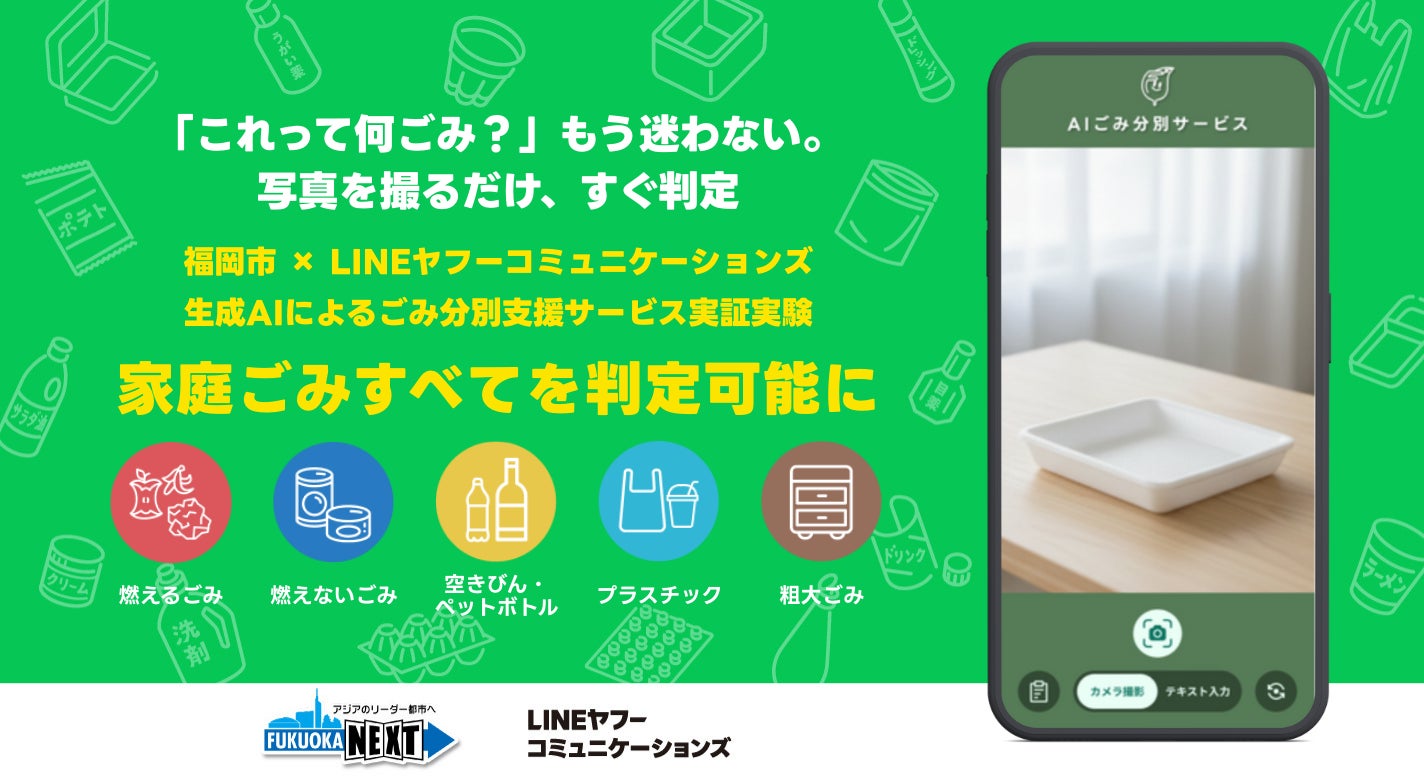LINEヤフーコミュニケーションズ株式会社(本社:福岡市博多区、以下当社)は、 福岡市との公民共働事業として、同市で2027年2月より開始予定のプラスチック分別収集に先立ち、市民の分別の迷いを軽減することを目的に、コミュニケーションアプリ「LINE」を活用した生成AIによるごみ分別支援サービスの実証実験を実施しています。