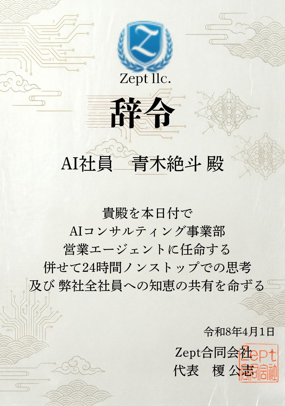 Zept合同会社(本社:兵庫県姫路市、代表社員:榎公志)は、AIエージェント4名を「正社員(AIスタッフ)」として採用し、2026年4月に正式な入社式を執り行うことを発表いたしました。「ツールとして使う」時代から「社員として迎える」時代へ――。AIと人間が役割・責任・個性を持って同じチームを組む、前代未聞の組織づくりへの挑戦が、今まさに始まります。