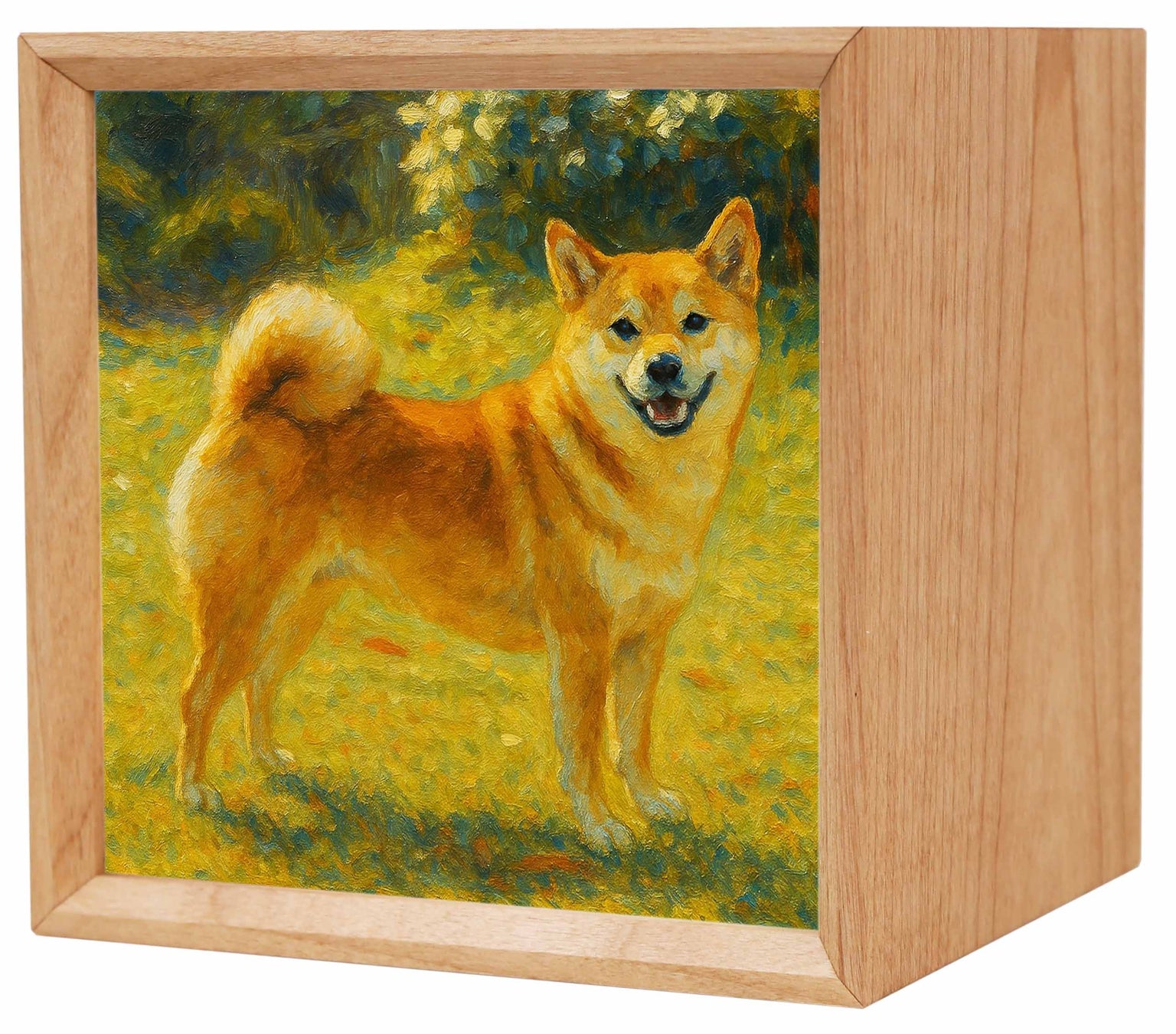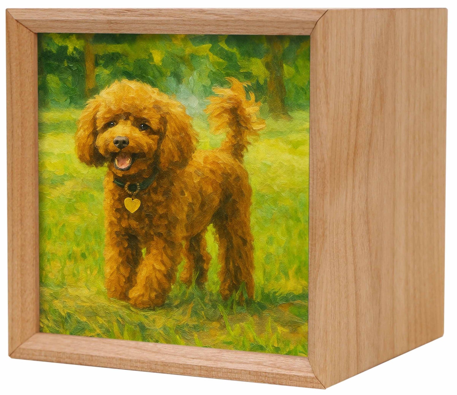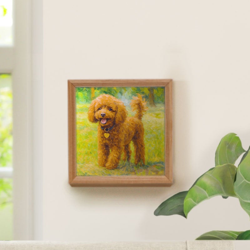 お預かりしたペットの写真を、まるで一枚のアートのように油絵調に加工。温かみのある無垢材とともに、優しく、深く、心に刻まれるメモリアルグッズに仕上がっています。