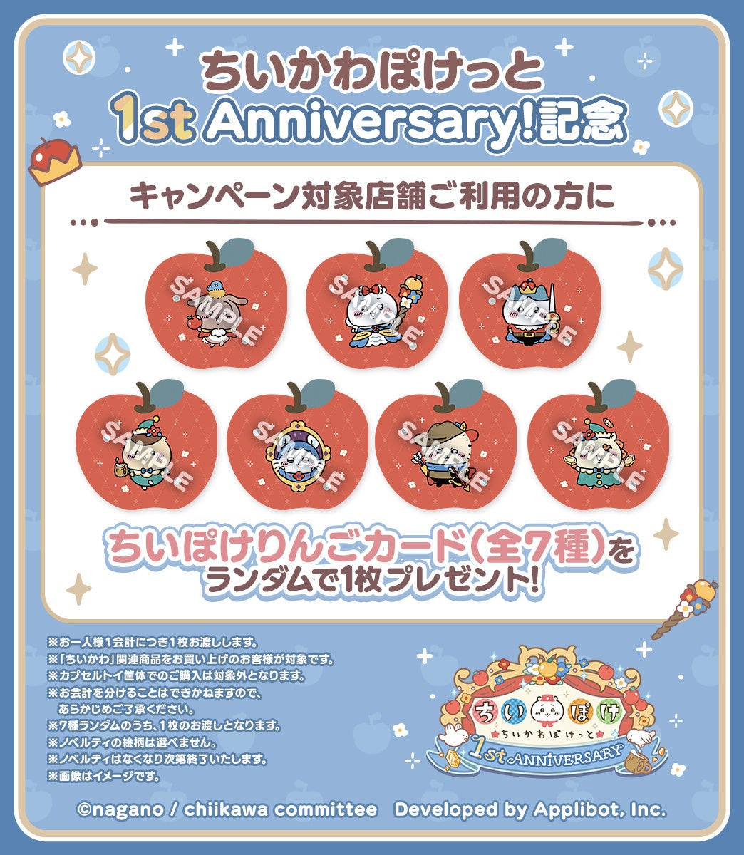 全国のキャンペーン対象店舗にて、お一人様1会計につき「ちいぽけりんごカード(全7種)」をランダムで1枚プレゼントいたします。配布詳細につきましては、公式Xのポストをご確認ください。