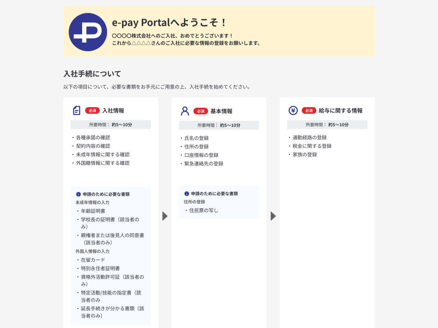 合格となったP/A応募者が、通勤経路や振込口座などの給与計算に必要な情報を申請する機能です。また、未成年・外国籍対象者は証明に必要な書類を申請するにあたって画像アップロードによる書類の提出が可能であり、P/A従業員の利便性を考慮した設計としています。 -